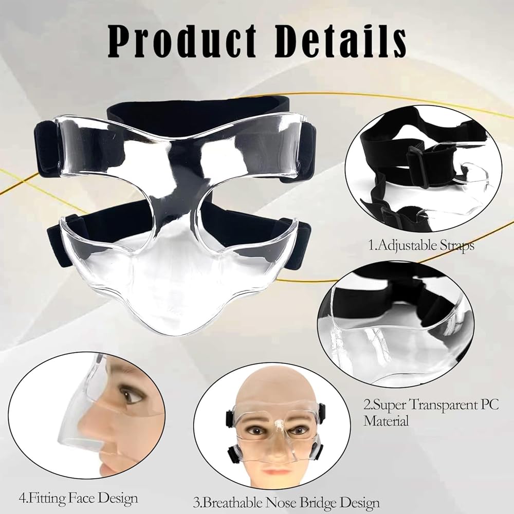 قناع حماية فعال للوجه. يعمل قناع حماية الأنف على تشتيت الطاقة الناتجة عن الاصطدام بشكل فعال ويمنع إصابات الوجه، وخاصة الأنف. يمكن استخدام القناع الرياضي لفترة طويلة ويوفر دعمًا وراحة كبيرين. يقلل قناع الوجه المكسور من أي إزعاج إضافي نتيجة الاصطدام.