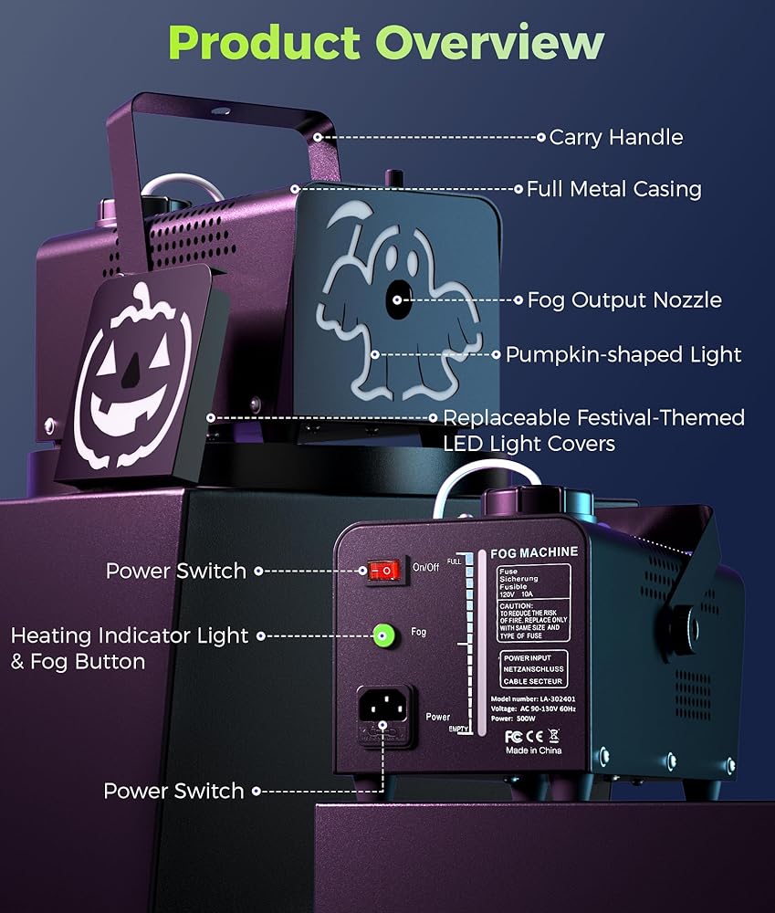 • مُنشئ أجواء احتفالية ومتعددة الاستخدامات: قم بتحويل أي تجمع إلى مشهد لا يُنسى! مثالي للهالوين، والكريسماس، وحفلات الزفاف، والحفلات، وفعاليات الدي جي، والعروض المسرحية، والنوادي، والحانات، والحفلات الموسيقية الحية، وأي احتفالات أخرى. تعتبر آلة الضباب هذه مع الإضاءة الديناميكية والأغطية التي تحمل طابع العطلات أيضًا هدية مثالية، مما يخلق لحظات سحرية في الداخل والخارج.