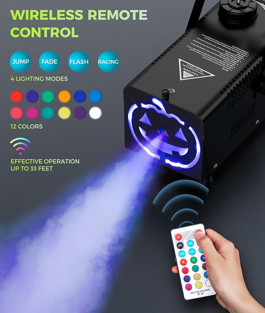 • 12 لونًا نابضًا بالحياة و4 أوضاع FX: أطلق العنان لإبداعك مع 12 لونًا مبهرًا من ألوان إضاءة LED و4 تأثيرات إضاءة ديناميكية (السباق، والقفز، والتلاشي، والفلاش) لتتناسب تمامًا مع أي مزاج أو موضوع. يمكنك ضبط السطوع وتبديل الأوضاع بسهولة عبر جهاز التحكم عن بعد، مما يسمح لك بمزامنة شاشة ضوء RGB الجذابة مع مخرج الضباب الدرامي.