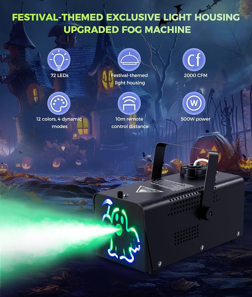 آلة الضباب IMONE بقدرة 500 وات 2000CFM 2 أغطية إضاءة مخيفة مع 72 مصباح LED مع 12 لونًا فاتحًا، وأجهزة تحكم عن بعد لاسلكية، للهالوين، وحفلات الزفاف، والحفلات، ومرحلة الدي جي، والاستخدام الداخلي والخارجي
