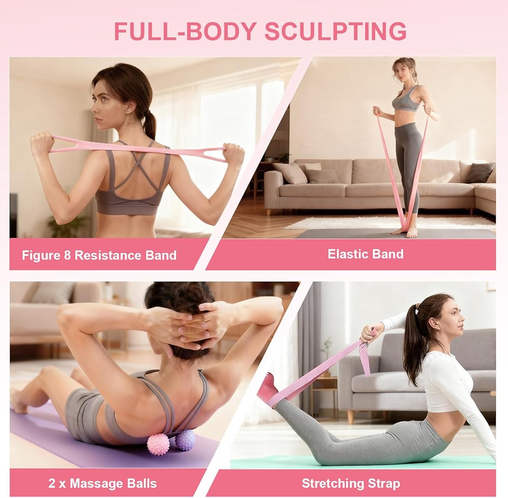 • تعدد الاستخدامات لتمرين الجسم بالكامل: تشتمل مجموعة البيلاتيس على أشرطة مقاومة وأدوات تمدد واسترخاء تعمل على تقوية العضلات والساقين والعضلات الأساسية والكتفين والذراعين بشكل احترافي مع تحسين المرونة. مناسبة لعشاق اللياقة البدنية من جميع المستويات
