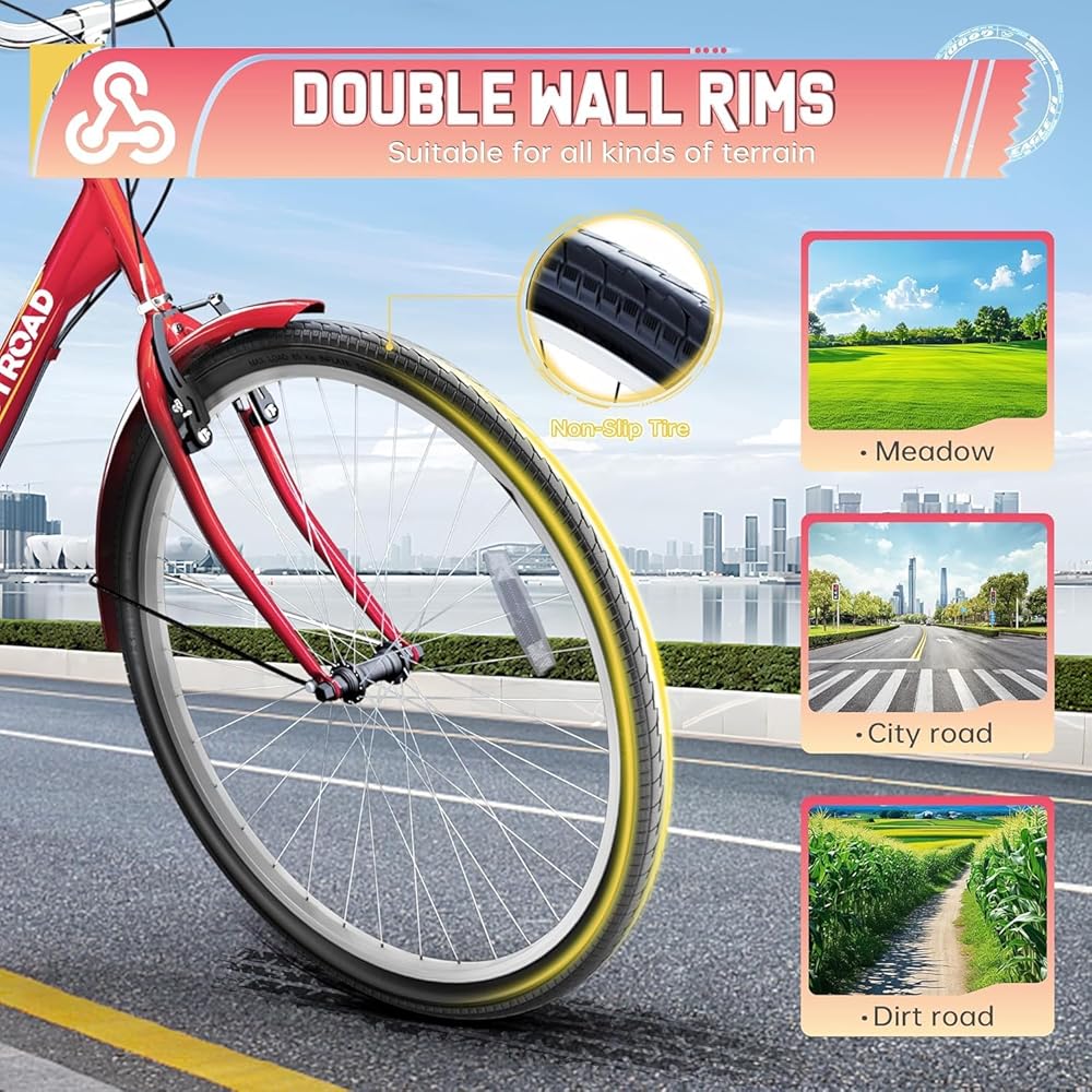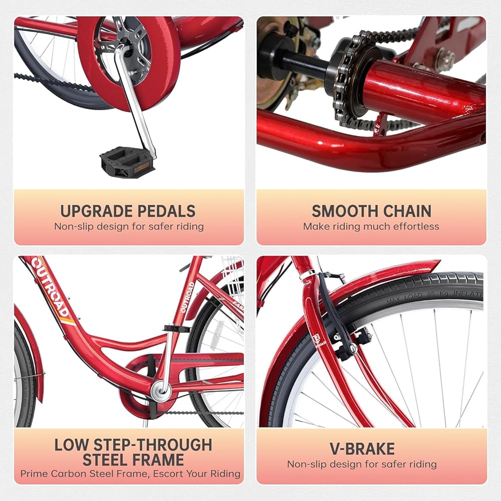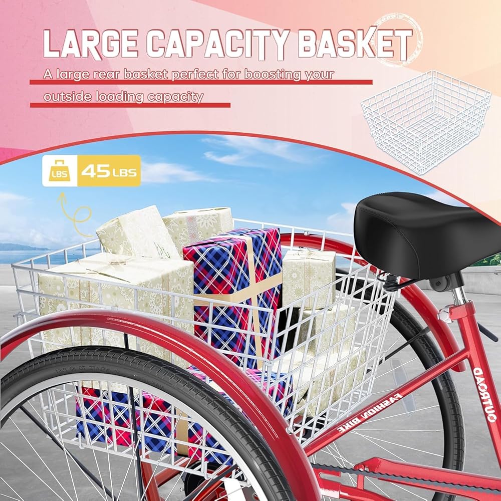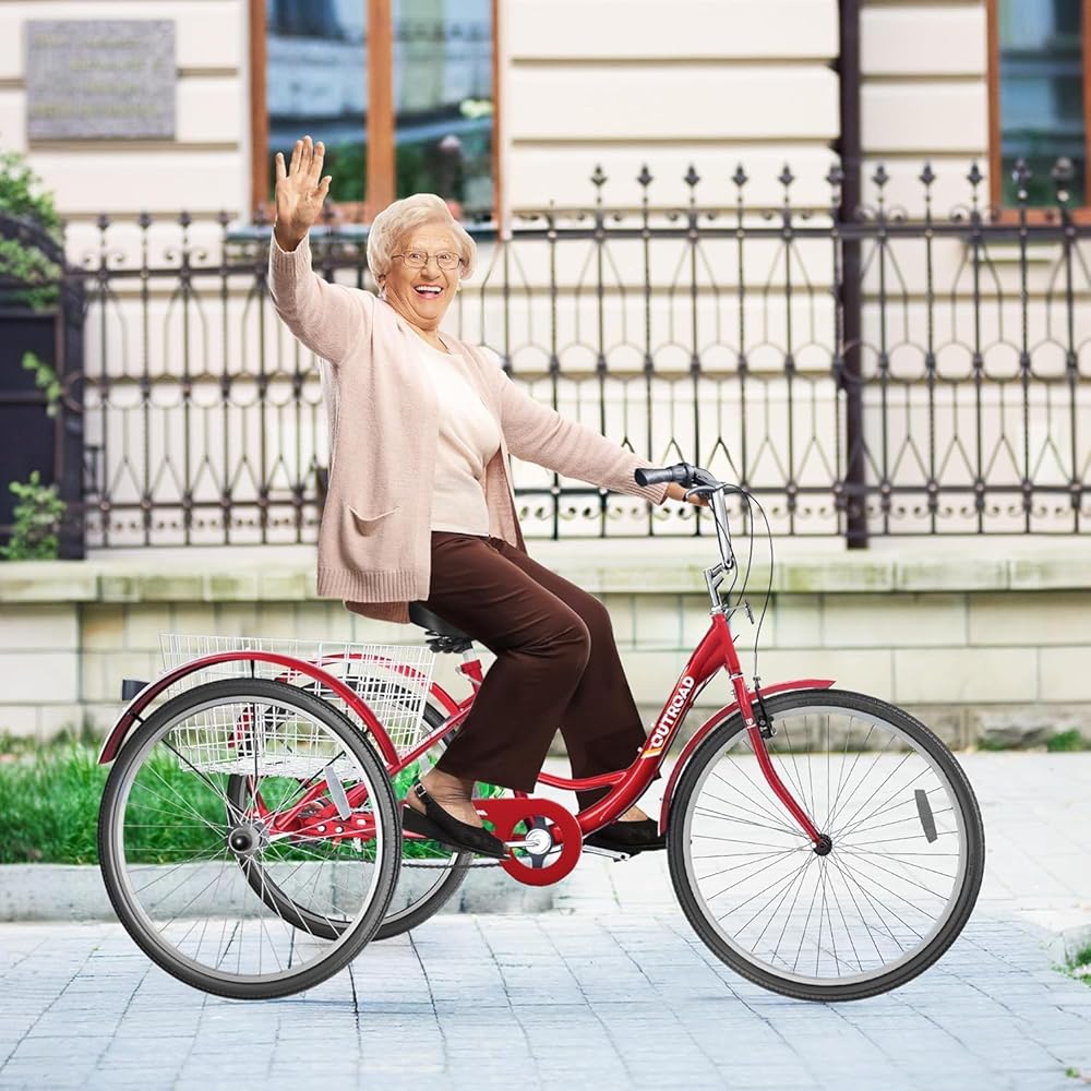 • 7 سرعات قابلة للتعديل: توفر دراجاتنا ذات العجلات الثلاث مقاس 24 و26 بوصة نظام تروس بـ 7 سرعات ليتناسب مع أي تضاريس؛ يمكنك بسهولة ضبط السرعة والمقاومة للانزلاق عبر المتنزهات ذات المناظر الخلابة أو شوارع المدينة الصاخبة بسهولة، والاستمتاع بمزيج مثالي من الاستقرار والتحكم والراحة