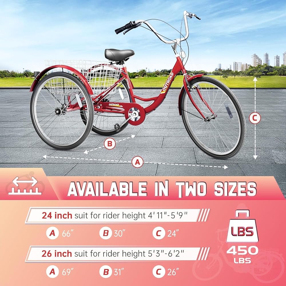 • خيارات مقاسات متعددة: تتوفر مقاسات وألوان متعددة. 24 بوصة لـ 4'9"-5'1"، 26 بوصة لـ 5'3"-6'2". ارتفاع المقعد قابل للتعديل، يمكنك تعديل الارتفاع وفقًا لاحتياجاتك. تأتي الدراجة الثلاثية للبالغين مع دليل وأدوات تجميع وما إلى ذلك