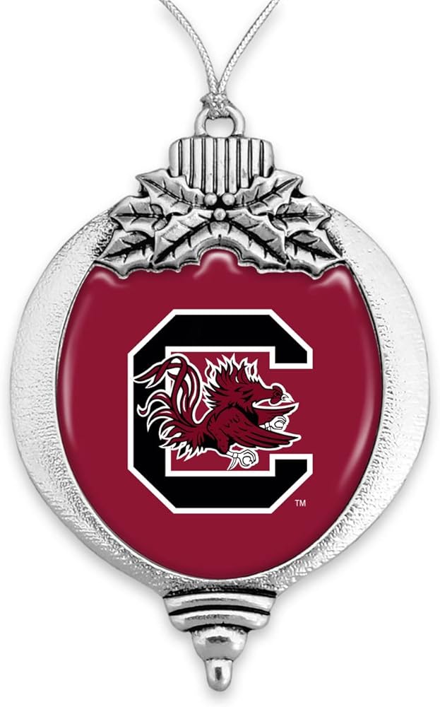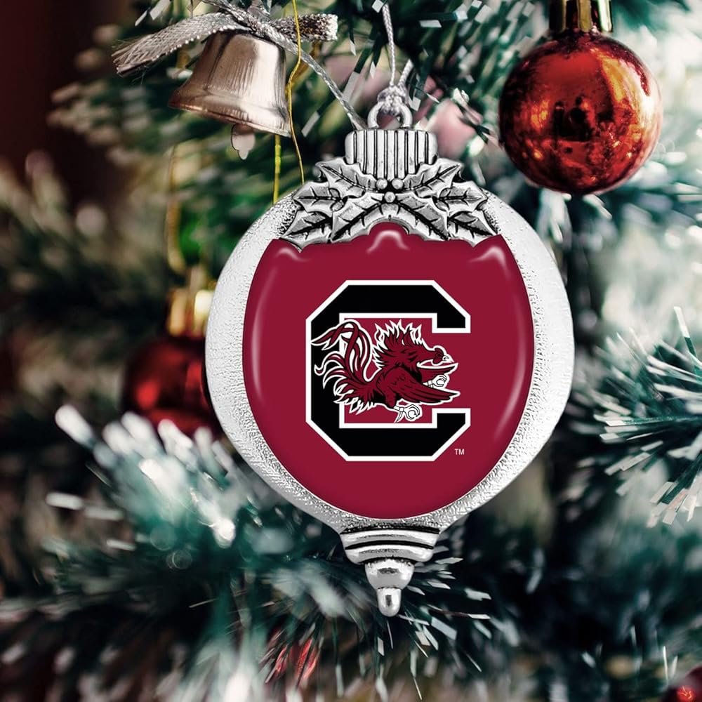 لمبة South Carolina Gamecocks USC مع شعار الفريق، زخرفة معدنية فضية لشجرة عيد الميلاد