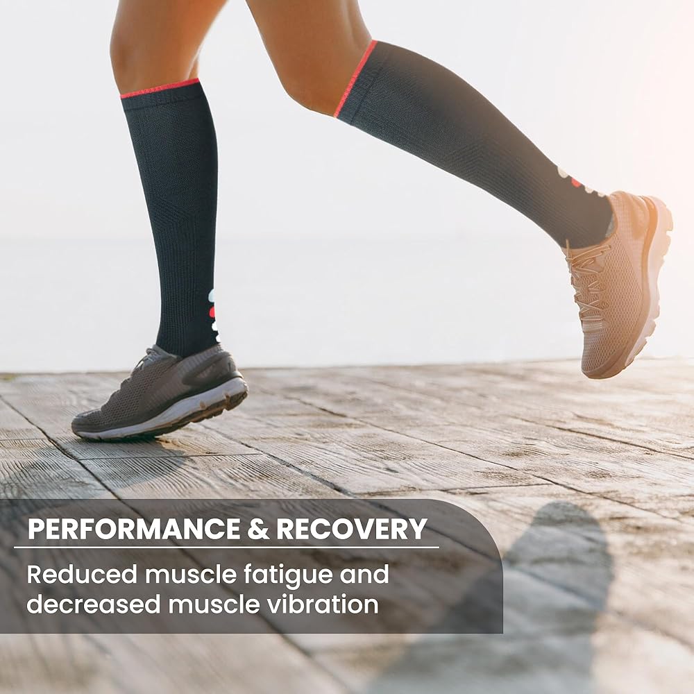 • ضغط قوي (20-30 ملم زئبق): مصنوع من 90% بولي أميد، 10% إيلاستين. تتميز الجوارب الرياضية الضاغطة لدينا بمستوى ضغط ثابت محسّن علميًا يبلغ 20-30 ملم زئبق. يعد هذا المستوى من الضغط مثاليًا للرياضيين أو المتعافين لأنه يعزز الدورة الدموية المحسنة، مما يضمن وصول الأكسجين والمواد المغذية إلى عضلاتك بشكل أكثر كفاءة. تساعد الدورة الدموية المتزايدة على تقليل إجهاد العضلات وتقليل التورم وتسريع عملية الشفاء، مما يسمح لك بالتدريب بشكل أقوى وتحقيق أهدافك.