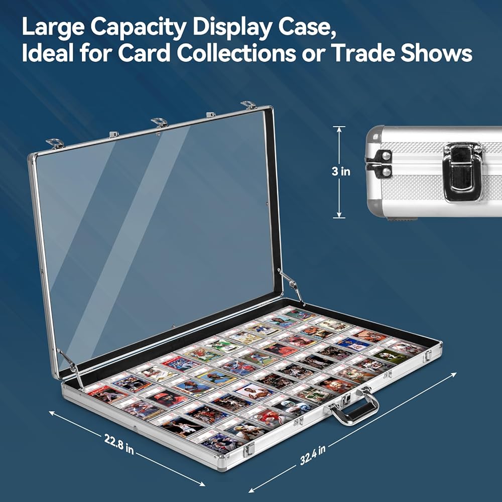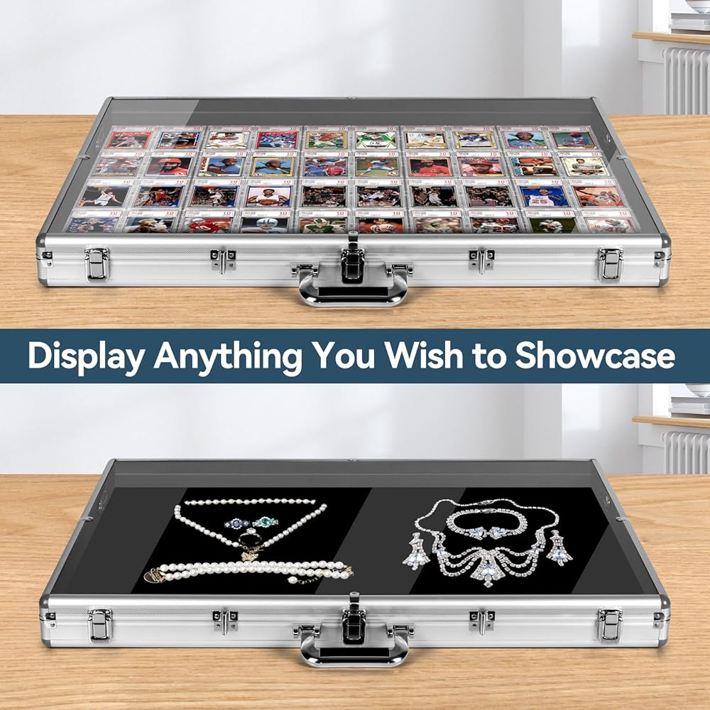 حافظة عرض للمعارض التجارية، حافظة بطاقات من الألومنيوم والأكريليك مع علاقة قابلة للقفل، حافظة عرض كبيرة على سطح الطاولة لبطاقات MTG والمقتنيات والمجوهرات ذات التصنيف PSA للبيسبول الرياضي