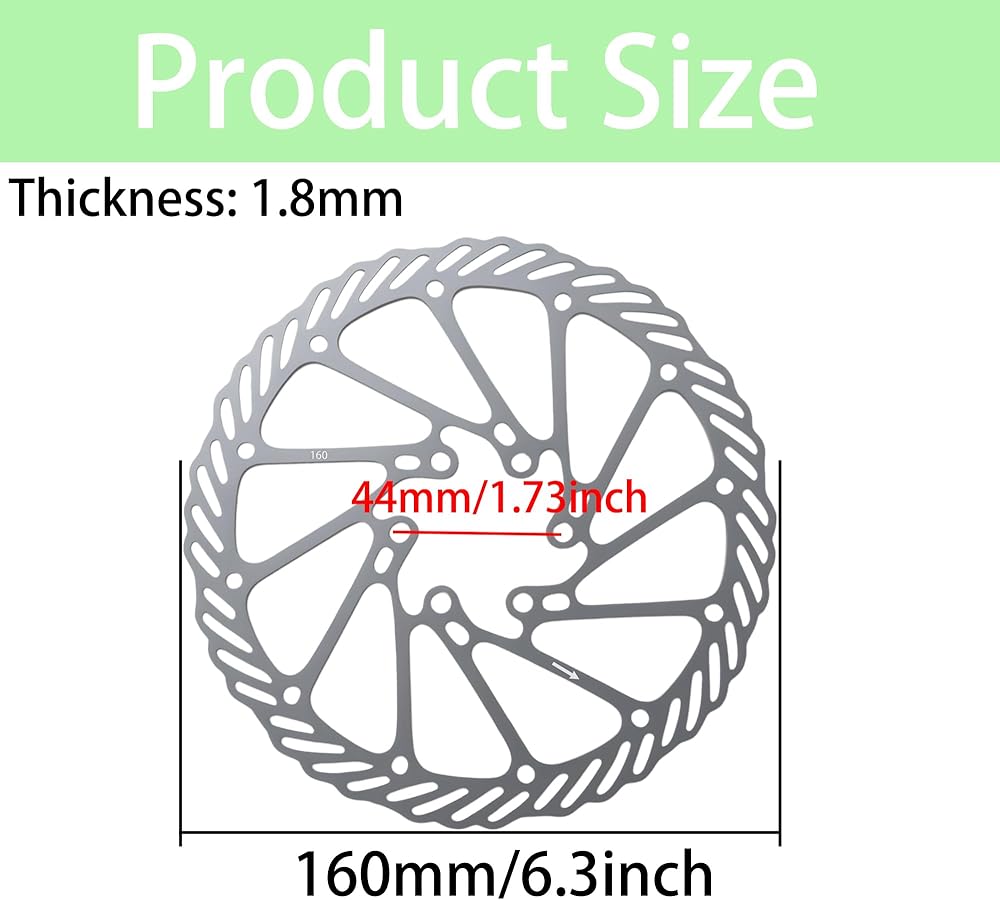 تتضمن العبوة: سوف تحصل على 1 × قرص فرامل من الفولاذ المقاوم للصدأ مع 6 براغي. الحجم: القطر الخارجي: 160 مللي متر/6.3 بوصة. المسافة المركزية: 44 مللي متر/1.73 بوصة. السُمك: 1.8 ملم.