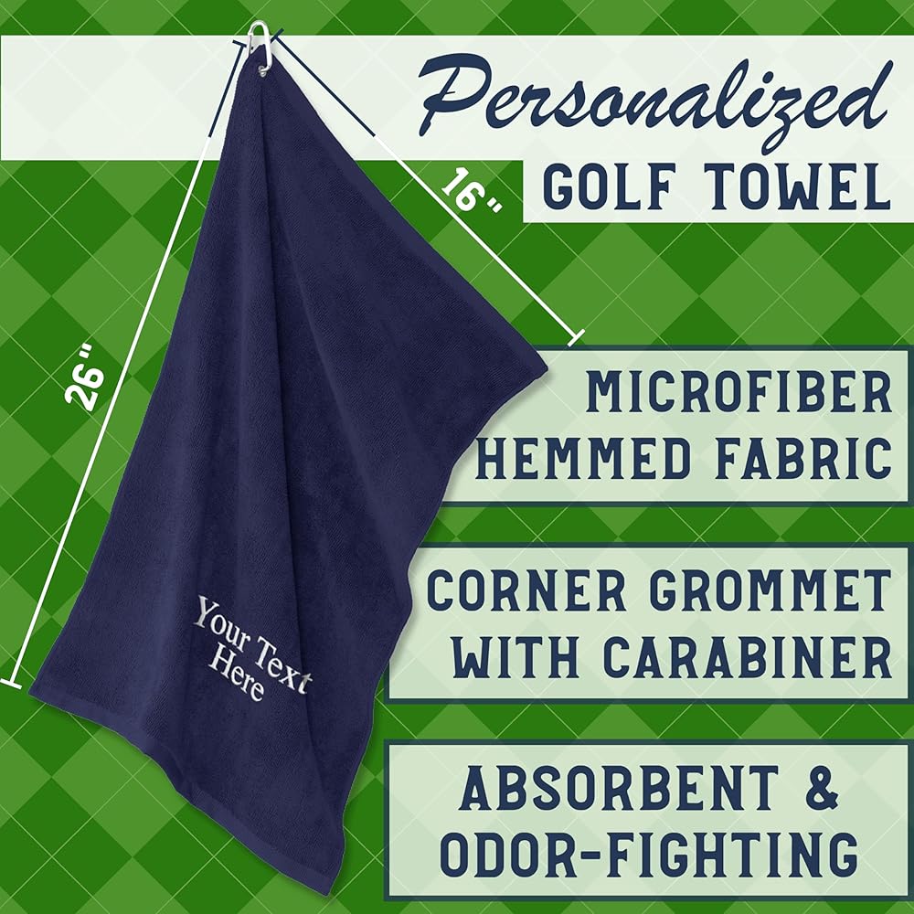 Tee up your gifting game with this Personalized Golf Towel, custom embroidered with one of 9 golf-themed design options featuring your name or initials. From stylish monograms to player silhouettes, each design is stitched with premium thread in your choice of 18 bold colors. The 26” x 16” towel is made from soft, absorbent microfiber (80% polyester, 20% polyamide) and includes a corner grommet with carabiner for easy attachment to any golf bag. Available in 6 classic colors—Navy, Royal Blue, White, Deep Smoke, Black, and Raspberry—this towel is the perfect mix of personalization and performance, making it a great gift for golfers of all levels.