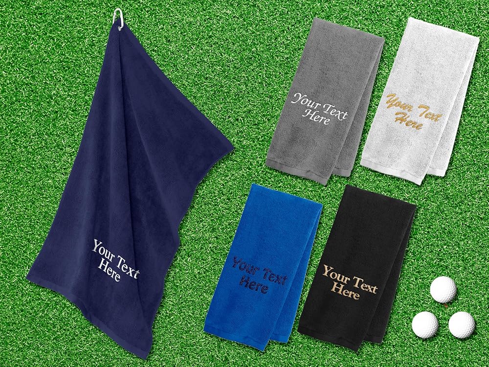 Personalized Golf Towel with Design – Customize this 26” x 16” microfiber towel with your choice of 9 unique golf-themed embroidery designs. Each design includes elements like golf clubs, balls, or player silhouettes, paired with your name or initials for a personal touch.