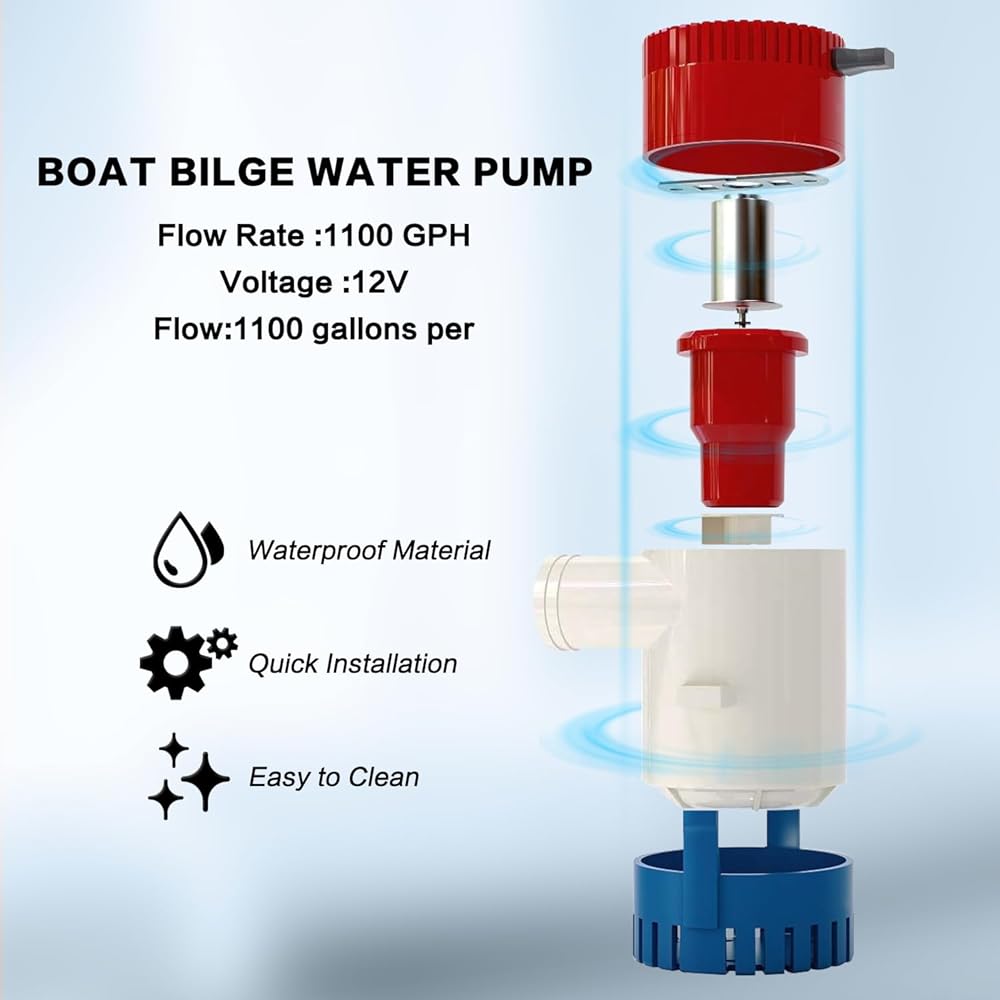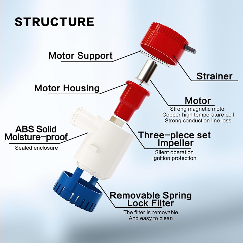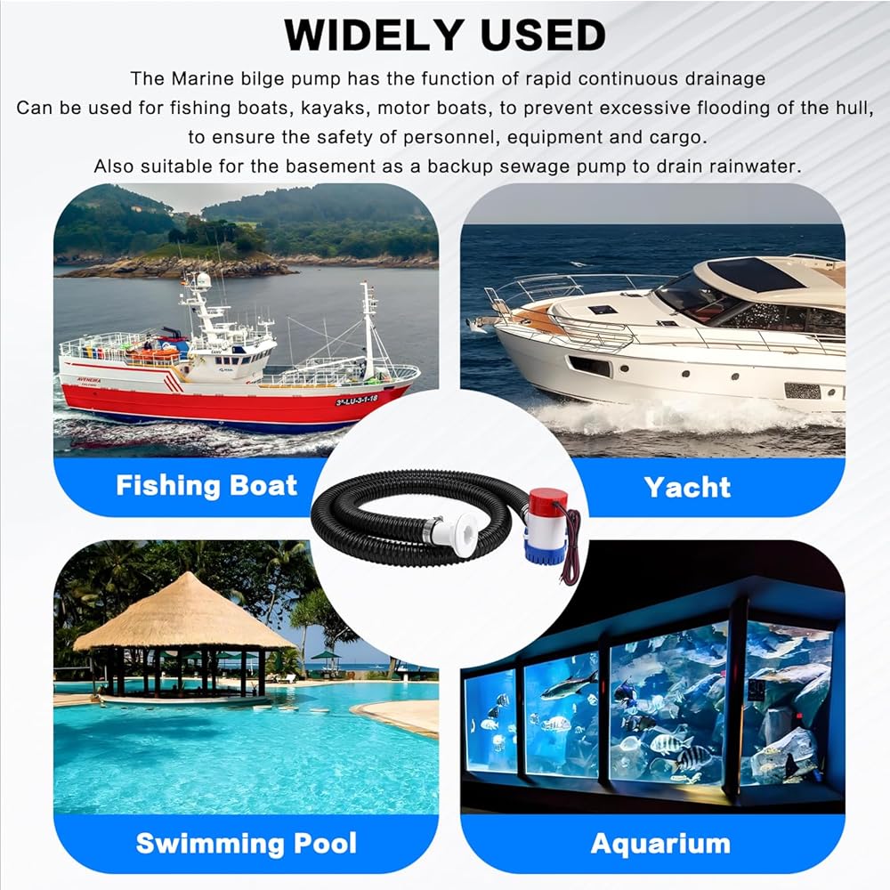 • هيكل متين: مضخة ماء للقارب 12 فولت مع غطاء من البلاستيك الحراري وعمود من الفولاذ المقاوم للصدأ. تصميم مقاوم للتآكل يتحمل المياه المالحة، والتعرض للأشعة فوق البنفسجية، وإزالة الماء المستمر بمعدل 1100 جيجا في الساعة