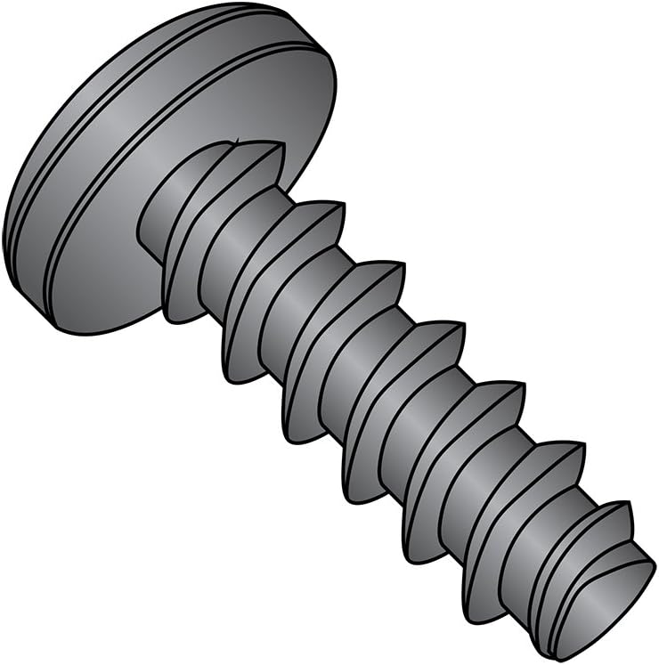 The steel thread rolling screw for use in plastic has a black oxide finish and a pan head with a Phillips drive. Steel is often used in applications where strength is the primary consideration. The black oxide finish offers mild corrosion resistance and lubricity. The pan head has a flat top and short vertical sides with a rounded top edge. The Phillips drive has an x-shaped slot that accepts a Phillips driver and is designed to allow the driver to slip out of the head to help prevent over-tightening and damage to the thread or fastener.Thread cutting and thread rolling screws, two types of self-tapping screws, are threaded fasteners that create a mating thread in the wall of a hole. The two screws differ from each other in the way that they create the threads. Thread cutting screws cut the wall of the hole to create the thread, creating material chips that need to be cleared away from the hole to prevent clogging. Thread rolling screws, also called thread forming screws, do not remove material but instead press against the wall of the hole to displace the material and form the threads.