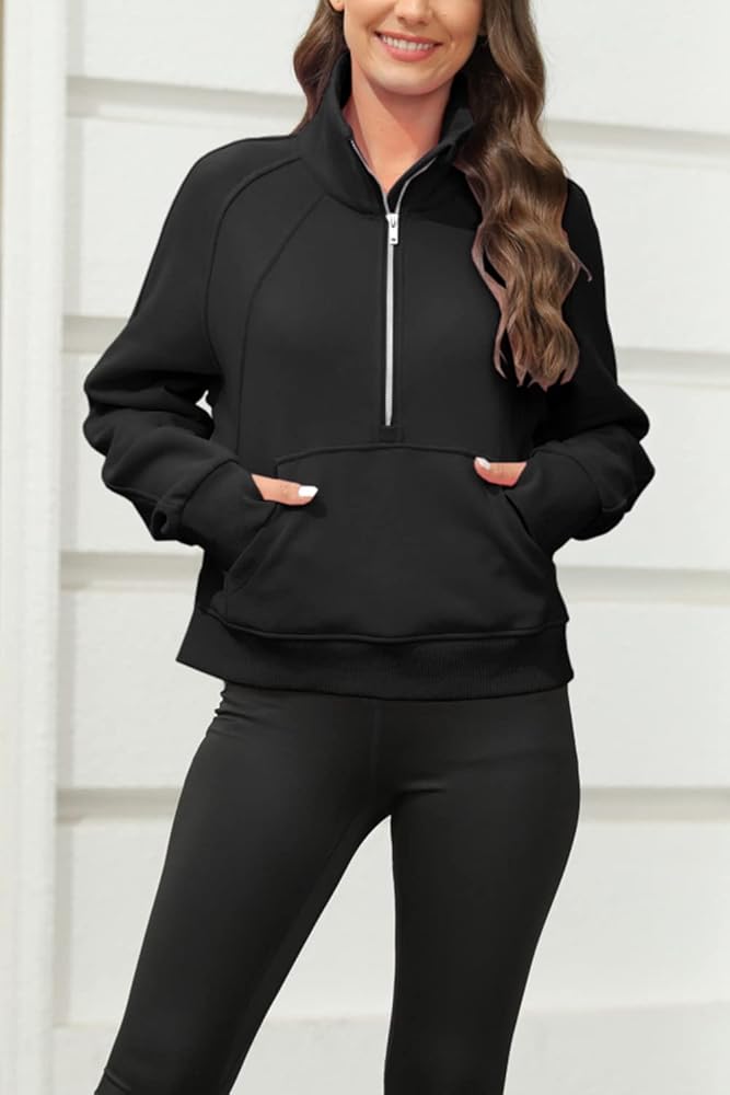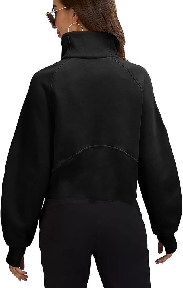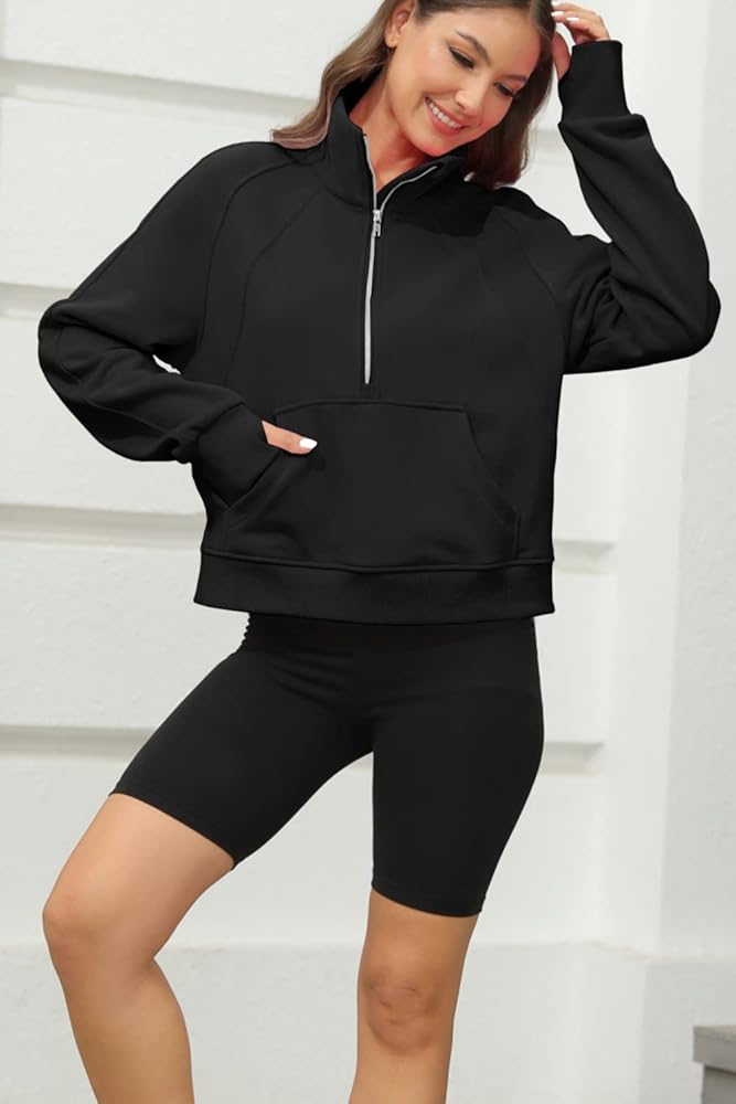 المميزات - سويت شيرت رياضي للتمرين / قمصان بأكمام طويلة للنساء / سويت شيرت بنصف سحاب / أطراف أكمام وحاشية مضلعة / جيوب كنغر / كتف منسدل / فتحة إبهام / نمط فضفاض قصير / قميص قصير للنساء / مقاس مريح / 1/2 ياقة بسحاب / رقبة على شكل قمع نصف سحاب / بلوفر نسائي