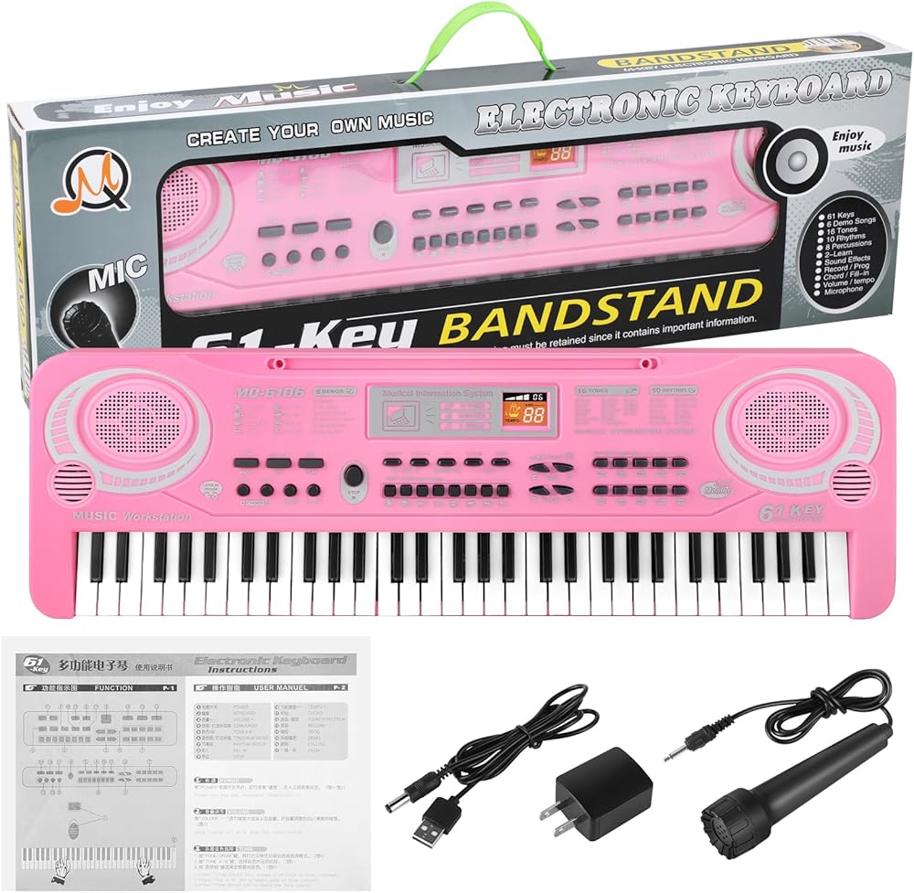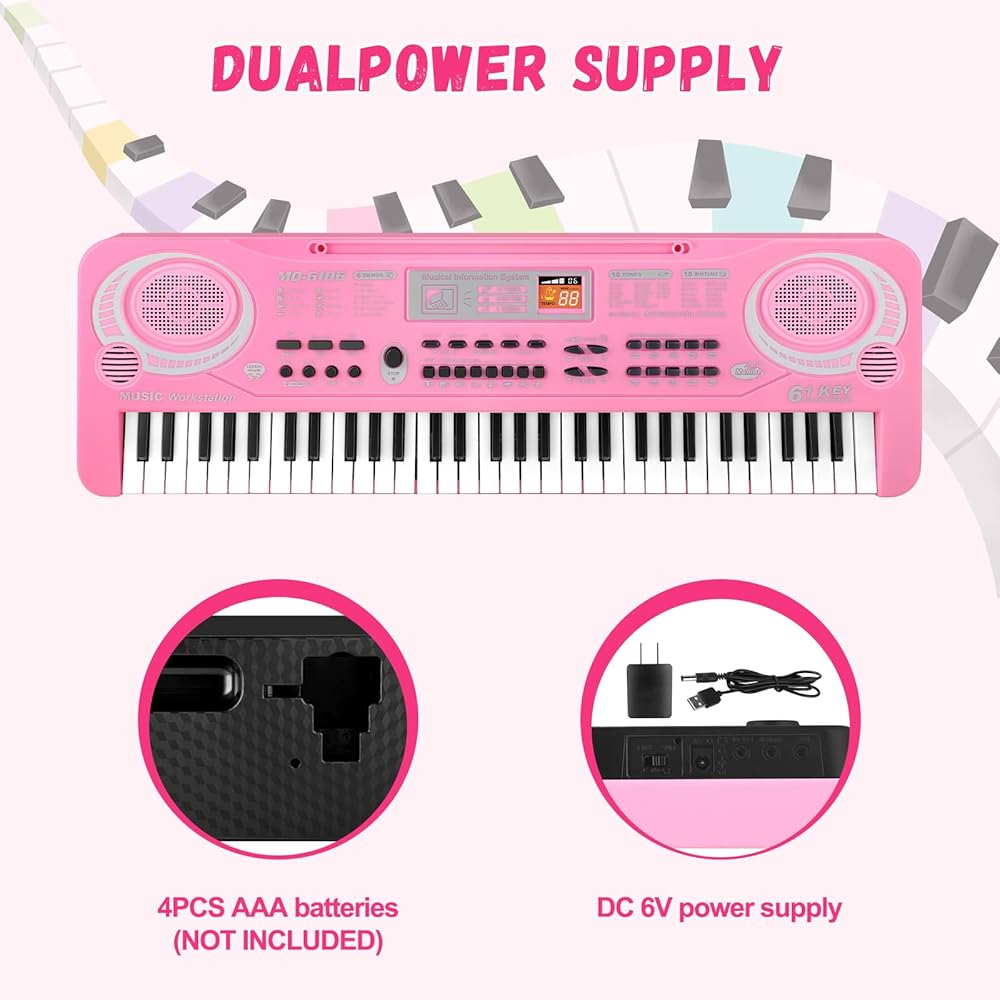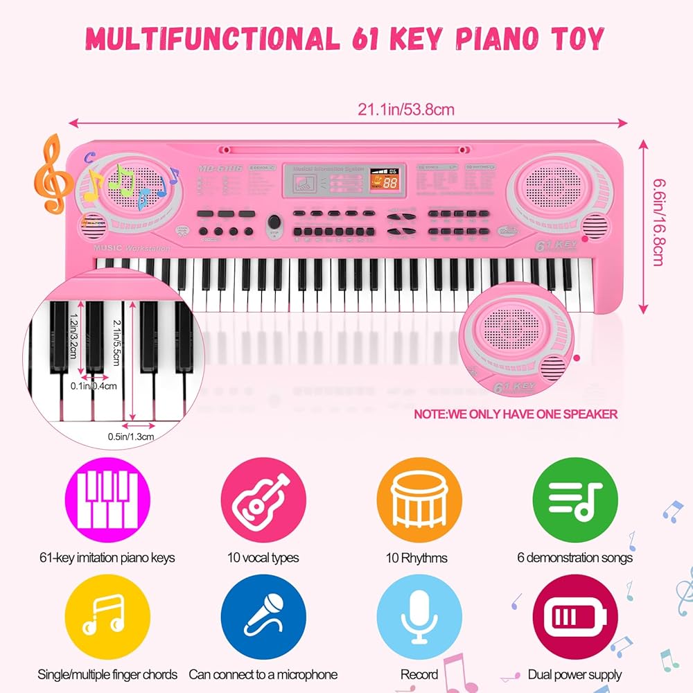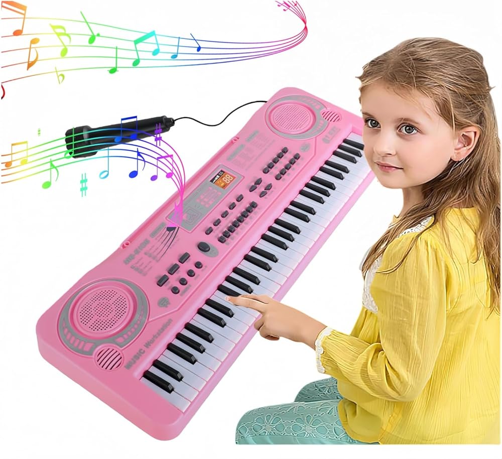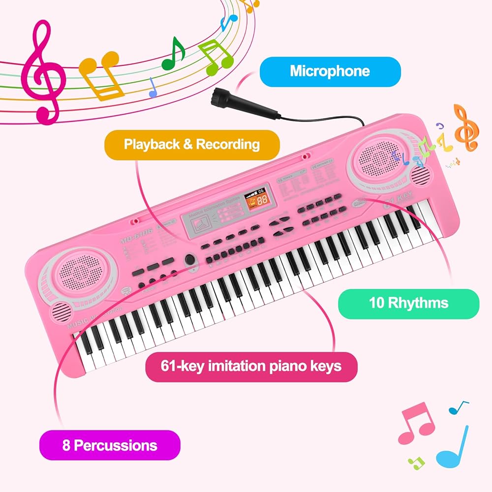 لعبة لوحة مفاتيح البيانو الموسيقية التعليمية: لوحة مفاتيح البيانو هذه مناسبة للأطفال المبتدئين لتعلم كيفية تشغيل لوحة مفاتيح البيانو الموسيقية، والمفاتيح المرجحة هي 61 مفتاحًا مشابهًا لـ 61 مفتاح بيانو قياسي. مع ميكروفون خارجي، يتيح لأطفالك الاستمتاع بالموسيقى. يمكن للأطفال التعلم واللعب في نفس الوقت