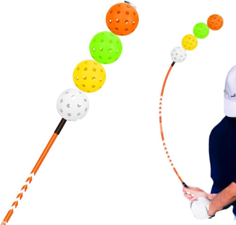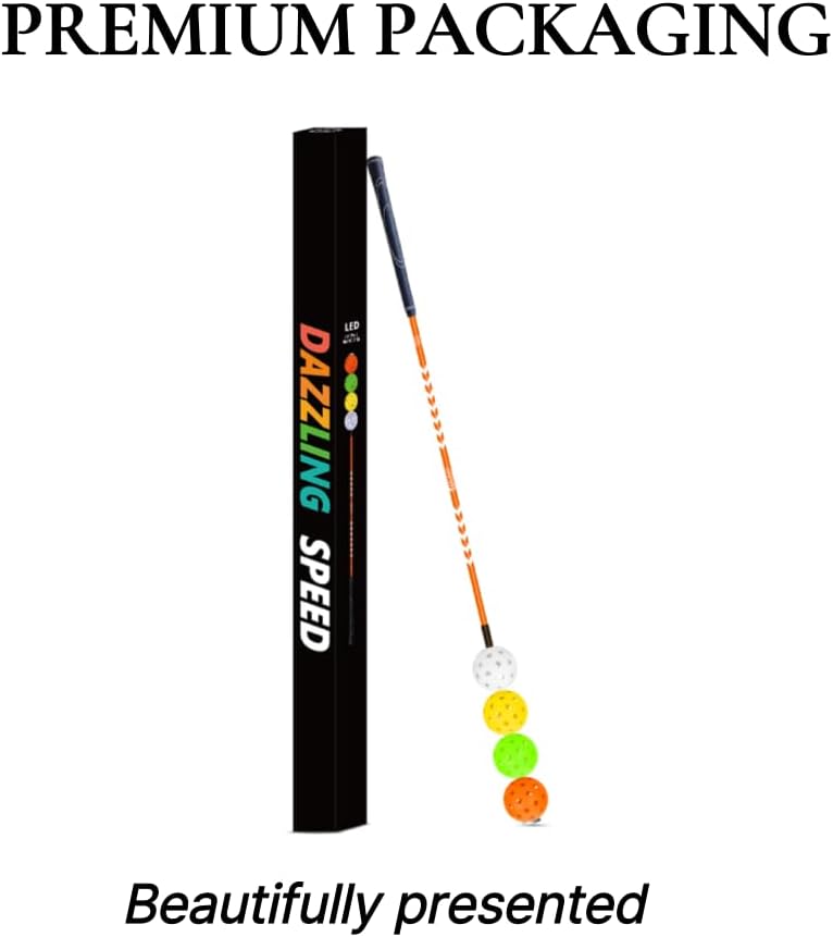 The Dazzling Speed swing trainer is built for golfers who want real-time feedback and powerful results. Designed with four LED balls featuring a total of 160 precision-cut holes, it generates strong air resistance to accelerate swing speed and boost driving distance. The built-in LED lights illuminate your swing path, allowing you to make immediate adjustments for a proper plane—even in low light. Crafted with a flexible shaft, it promotes natural lag and smooth rhythm for a more rhythmic swing. To activate the LED lights, simply turn the switch on the ball to the right using the included key or your fingers. To turn the lights off, rotate the switch to the left. If the LED lights stop functioning after extended use, replace the switch using the included spare. To replace, gently rotate the old switch and pull it out; then insert the new one and twist to secure it. Portable and easy to use both indoors and outdoors, the Dazzling Speed trainer helps golfers of all levels develop consistency and distance in every session. What's Included – Dazzling Speed Swing Trainer (with flexible shaft) – 4 LED pickleballs (pre-installed) – 1 key tool for LED activation – 1 spare LED switch