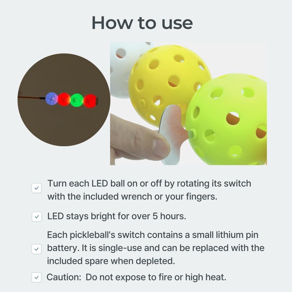 • Safe and Durable LED Pickleballs—This stick features four LED pickleballs, made from the same lightweight and durable material used in the popular sport of pickleball. These balls provide a soft, safe impact and can be used comfortably by anyone, anytime.