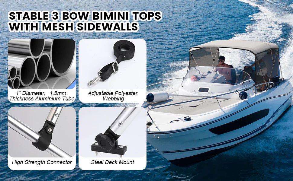 • Detachable Mesh Sidewalls: The bimini tops are equipped with 2 removable mesh sidewalls that block 80% of sunlight and UV rays and maintain excellent visibility and ventilation, allowing the boat canopy to be zipped or zipped up quickly and easily.