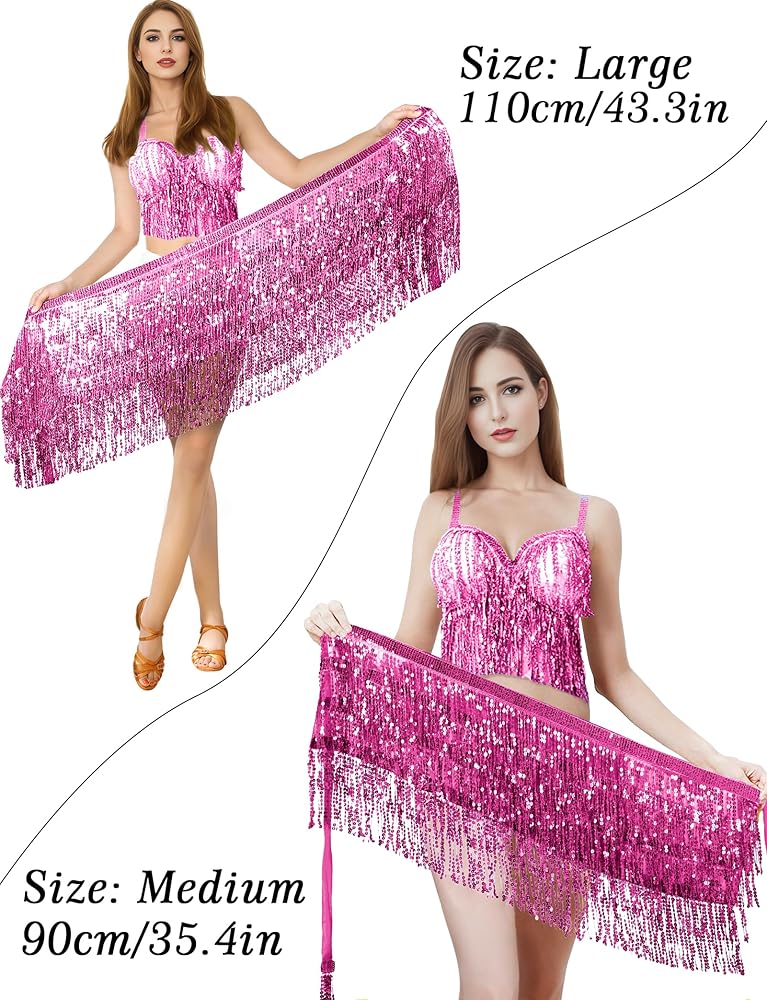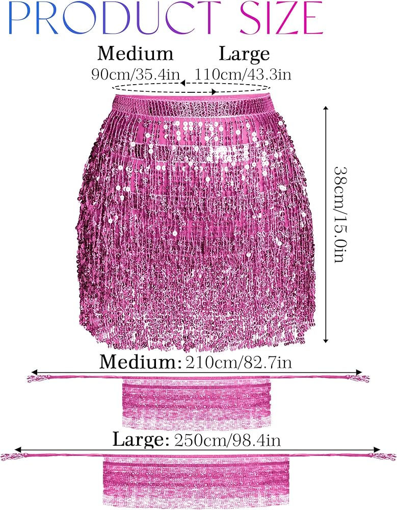 【تصميم محسّن】 وشاح الورك للرقص الشرقي الخاص بنا ذو مقاس حر للنساء والفتيات. لحل مشكلة التغطية غير الكافية، قمنا بشكل خاص بإطالة الجزء الزخرفي من التنورة الملفوفة ذات الشراريب اللامعة وصنعنا مقاسين، 90 سم/35.4 بوصة و110 سم/43.3 بوصة، حتى تتمكن من اختيار المقاس المناسب وفقًا لمحيط خصرك. مزود بحزام شيفون طويل بما فيه الكفاية قابل للتعديل، سهل ضبط المرونة وفقًا لمحيط الخصر، سهل الارتداء والخلع!