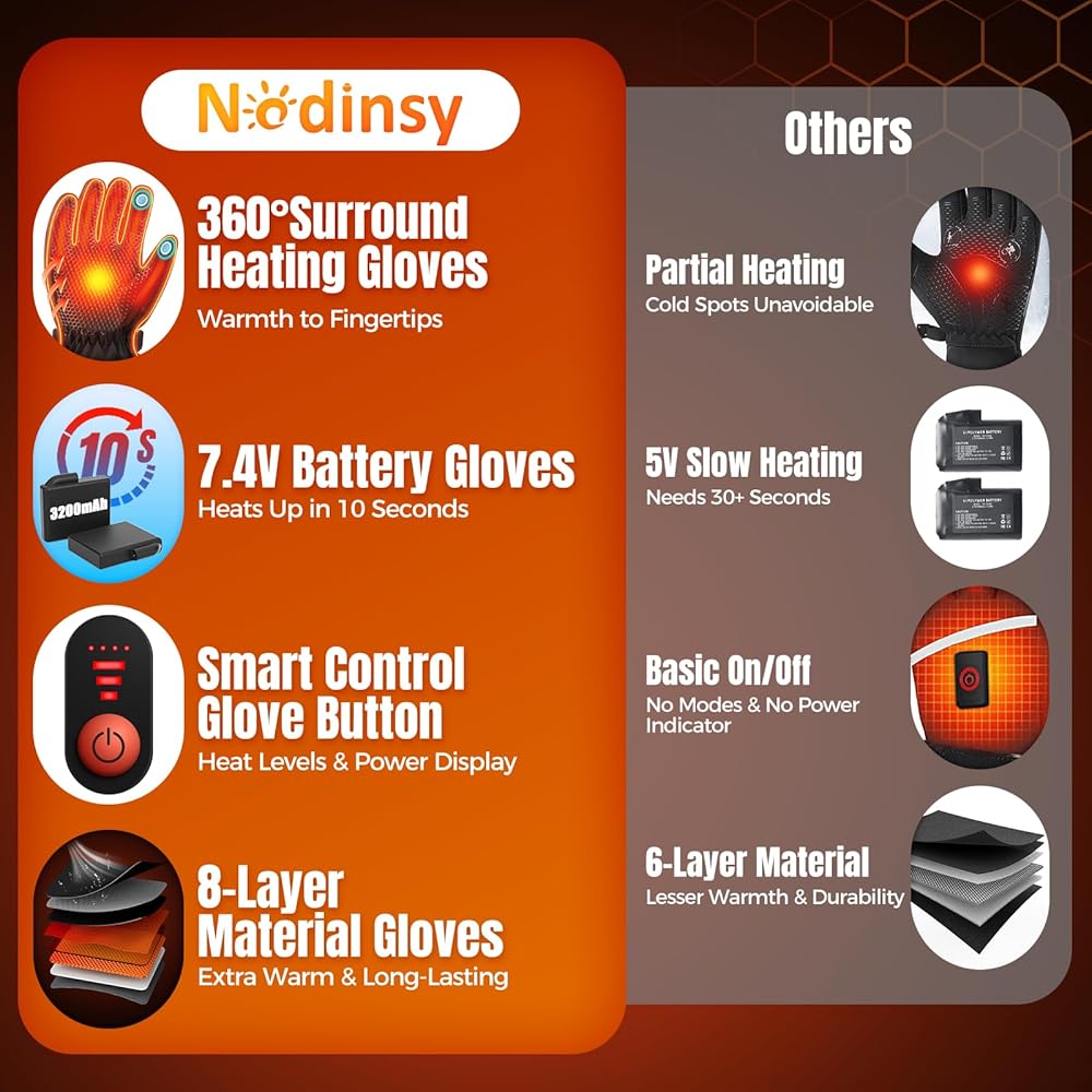 قفازات تسخين متساوية - قفازات Nodinsy الساخنة مصنوعة من مادة ألياف مركبة مقاومة للحرارة العالية وتتميز بأسلاك تسخين تغطي كلتا اليدين، مما يضمن توزيعًا متساويًا للدفء في جميع أنحاء القفازات للحفاظ على راحة يديك ودفئهما.