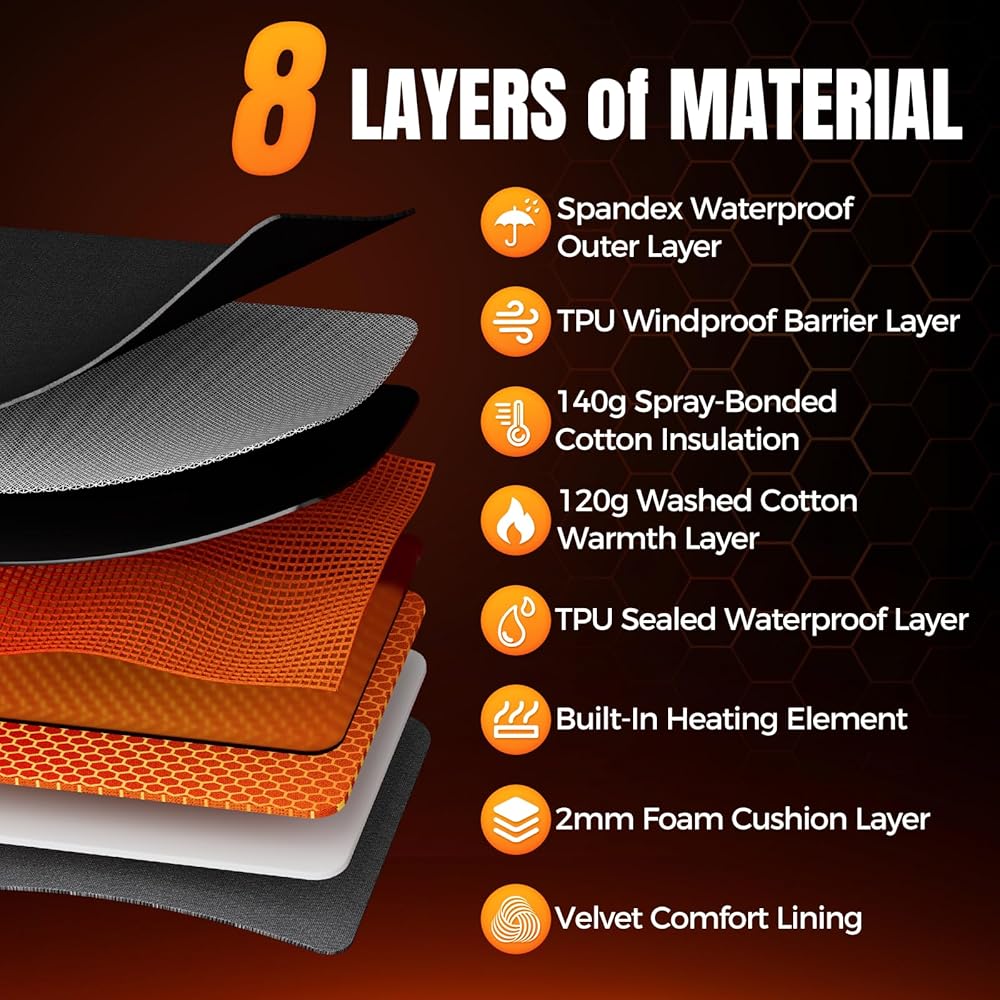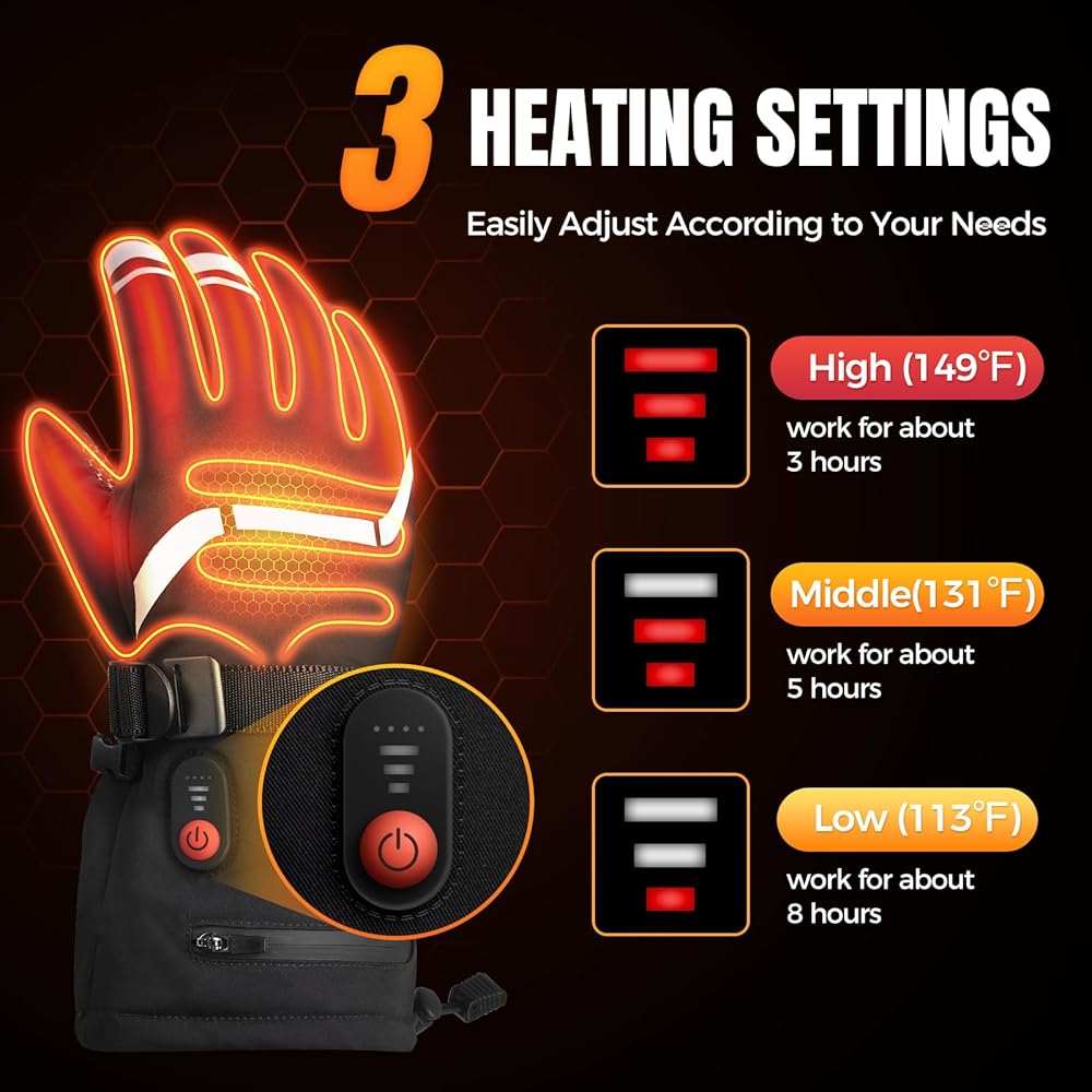عمر بطارية أطول - قفازاتنا الساخنة مجهزة ببطارية عالية السعة 2 × 7.4 فولت 3200 مللي أمبير في الساعة تدوم حتى 8 ساعات. يختلف عمر البطارية بناءً على إعدادات الحرارة: حرارة منخفضة (113 درجة فهرنهايت)، حرارة متوسطة (131 درجة فهرنهايت)، حرارة عالية (149 درجة فهرنهايت)، مما يوفر حوالي 8 و5 و3 ساعات من الاستخدام، على التوالي. يتم عرض الطاقة المتبقية على لوحة التحكم الخاصة بالقفاز، مما يسمح لك بمراقبة مستويات البطارية وتقدير وقت الاستخدام المتبقي بفعالية.