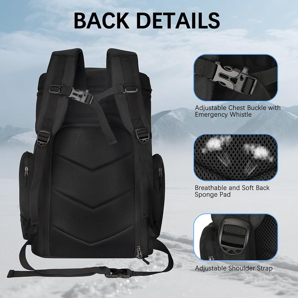 ❄️سعة تخزين 65 لتر: مقاس حقيبة أحذية التزلج 13 بوصة × 14.5 بوصة × 21 بوصة، وتمتلك 65 لترًا من سعة التخزين؛ تأتي حقيبة الظهر لأحذية التزلج مع 7 مساحات تحافظ على جميع معداتك في واحدة: حجرة رئيسية لأحذية التزلج، ومساحة تخزين علوية للخوذة، وغرفة مخملية علوية لحماية نظارتك من الخدوش، وجيبين أماميين لتخزين سترة التزلج السميكة أو البنطلون أو القفازات والجوارب، وجيبين جانبيين لتخزين الزجاجات أو أشياء أخرى،