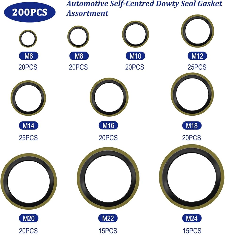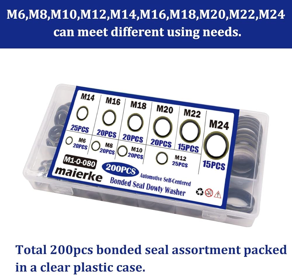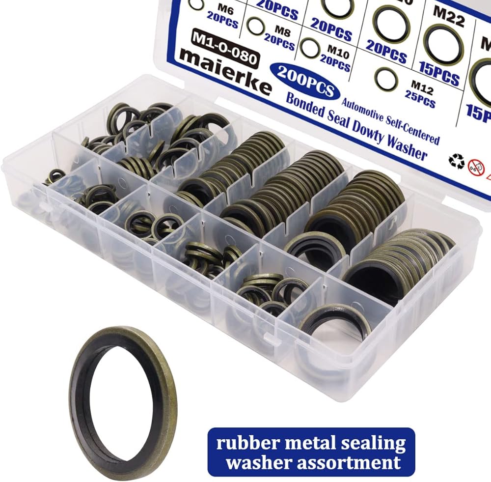 maierke 200 قطعة من غسالة السيارات ذات الختم المربوط ذاتيًا، 10 أحجام مترية (M6 إلى M24) مجموعة متنوعة من حشية غسالات الزيت مع صندوق، للسيارات والمحامل والمضخات، استبدل M1-O-080
