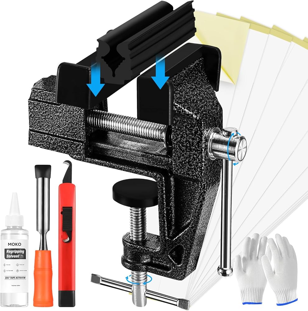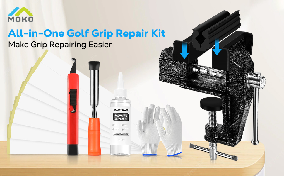 مجموعة موكو لمقبض الجولف لإعادة الإمساك بالنوادي، مجموعة أدوات إعادة الإمساك المحمولة للجولف، تتضمن شفرة خطاف وأشرطة ومشبك مطاطي وملزمة مقاعد البدلاء ومزيل الشريط والقفازات والمذيبات والفوهات، سهلة الاستخدام