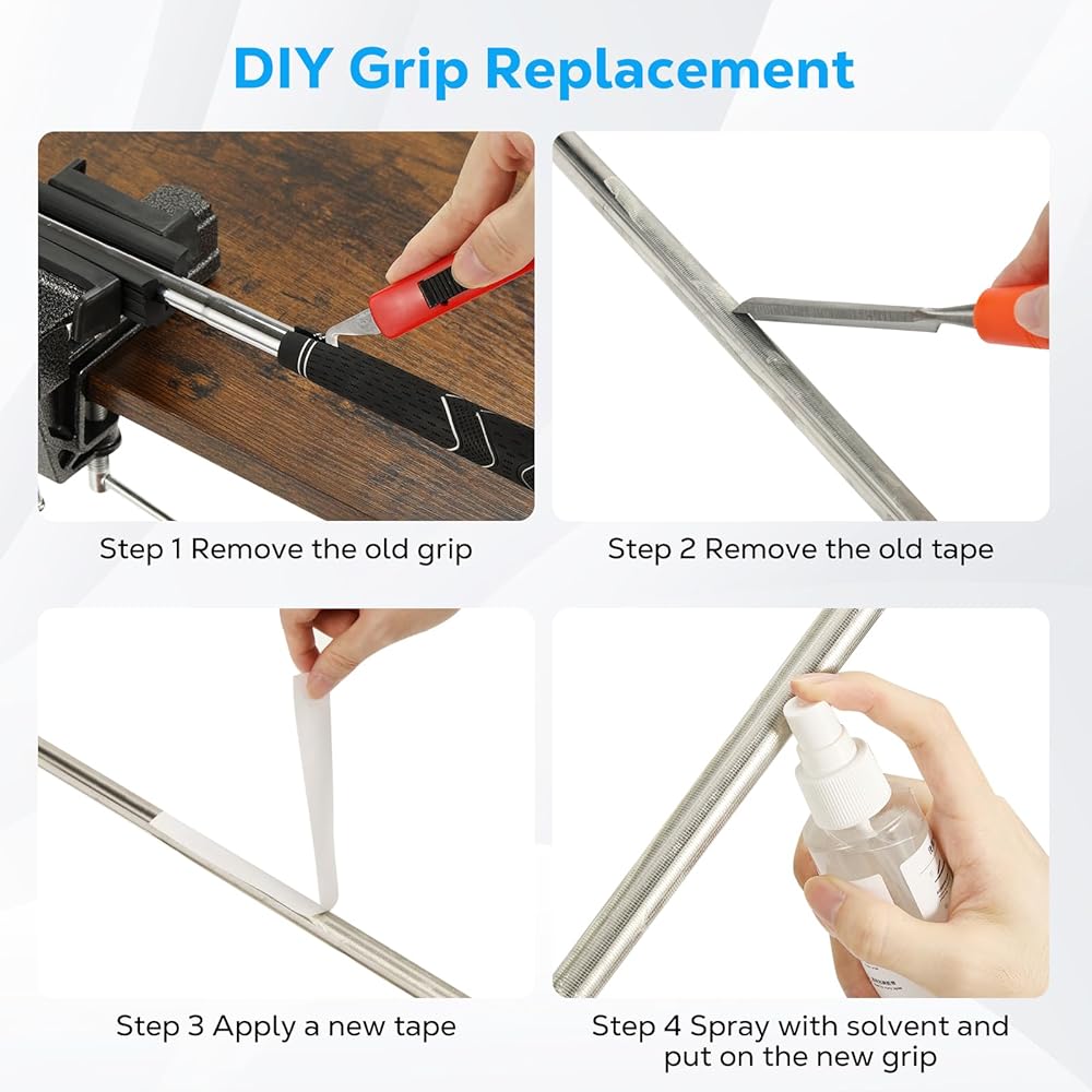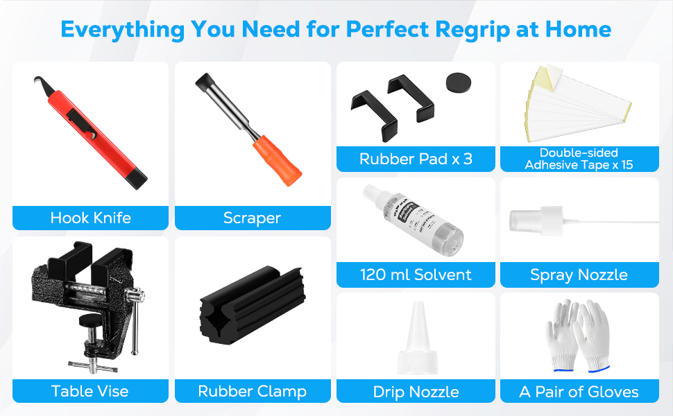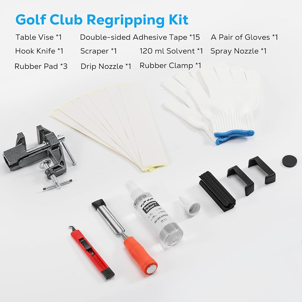• مجموعة قبضة نادي الجولف الاحترافية: تحتوي مجموعة إعادة الإمساك على جميع الأدوات التي تحتاجها لاستبدال قبضتك، بما في ذلك شفرة الخطاف × 1، مزيل الشريط × 1، ملزمة المقعد × 1، المشبك المطاطي × 1، شريط قبضة الجولف × 15، 120 مل مذيب × 1، بخاخ × 1، فوهة تنقيط × 1 وزوج من القفازات. لا حاجة إلى عمليات شراء إضافية، قم بتحديث قبضات الجولف الخاصة بك بسهولة.