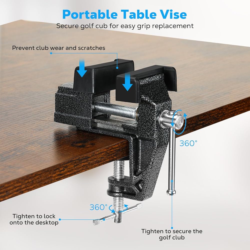 • تصميم ثابت وغير قابل للانزلاق: تم تجهيز مجموعة إعادة الإمساك بنادي الجولف بملزمة نادي الجولف ومشبك مطاطي لتثبيت قبضة الجولف في مكانها بشكل آمن. يمكن تثبيت ملزمة المقعد بسهولة على الطاولة وتدعم التعديل متعدد الزوايا لضمان التشغيل المستقر دون الإضرار بمضرب الجولف.