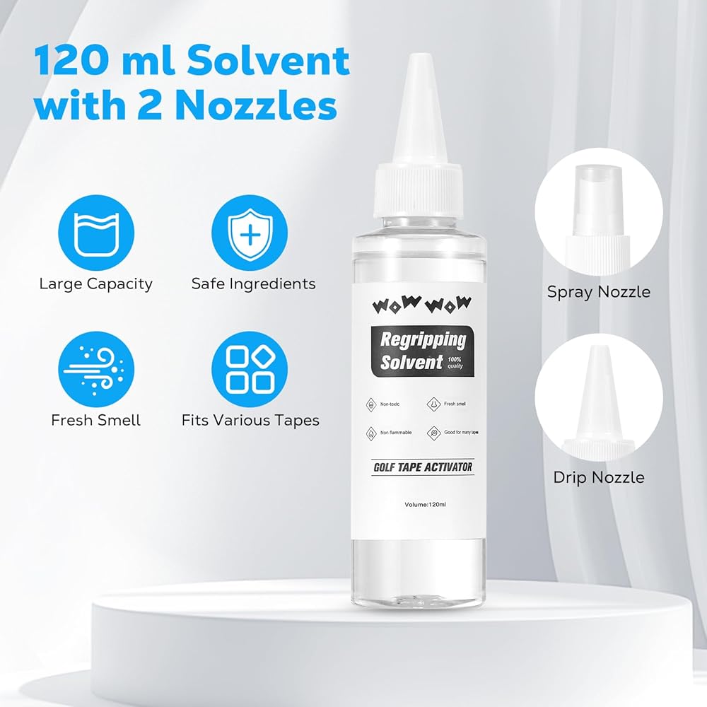 • شريط قبضة نادي الجولف والمذيبات: يبلغ مقاس شريط قبضة الجولف الممتد على الوجهين 2 بوصة × 18.5 بوصة وهو سهل التقشير واللصق. يأتي مع 120 مل من مذيب قبضة الجولف الآمن وغير المهيج، والذي يمكن استخدامه مع جميع الأشرطة اللاصقة لضمان ملاءمة محكمة وتركيب سلس للمقابض الجديدة.