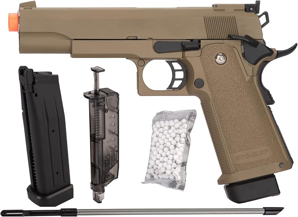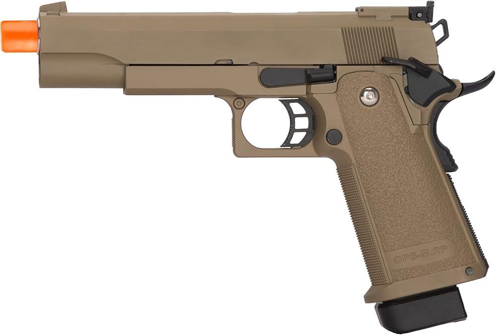 The Golden Eagle Hi-Capa 5.1 Gas Blowback Airsoft Pistol features realistic gas blowback action and is designed after modern 1911 variants. Unlike other GBB pistols, this Golden Eagle Hi-Capa sits at an affordable price point. It features a skeletonized trigger, shortened spur hammer and extended magazine base plate that makes it easy to quickly reload. About Golden Eagle Golden Eagle offers affordable, field-ready AEGs. They are committed to bringing the best value and the best performance to airsoft players. Every airsoft AEG manufactured by Golden Eagle features a metal gearbox firing well above the FPS (feet per second) of most high end and expensive airsoft AEGs on the market! For an affordable and dependable airsoft gun, Golden Eagle is a great choice whether you want to build off a base gun or you're just getting started.