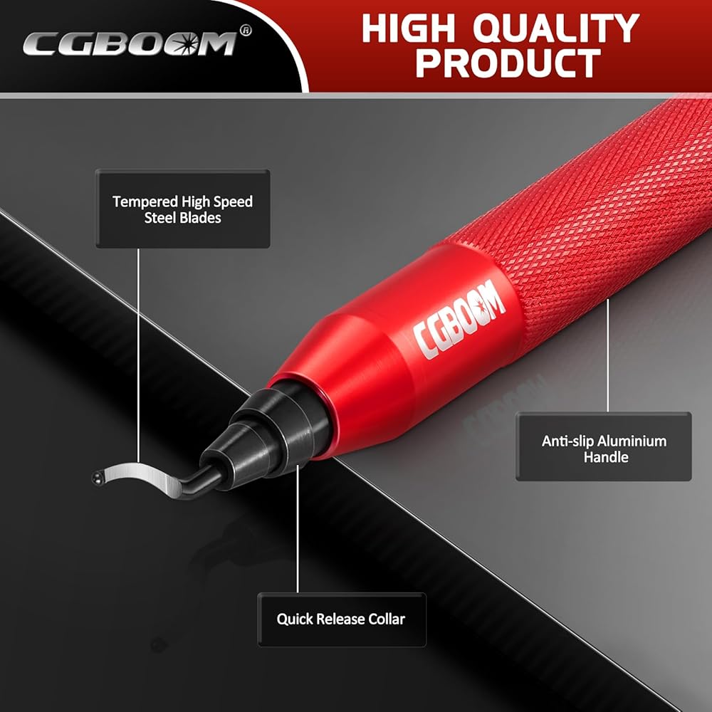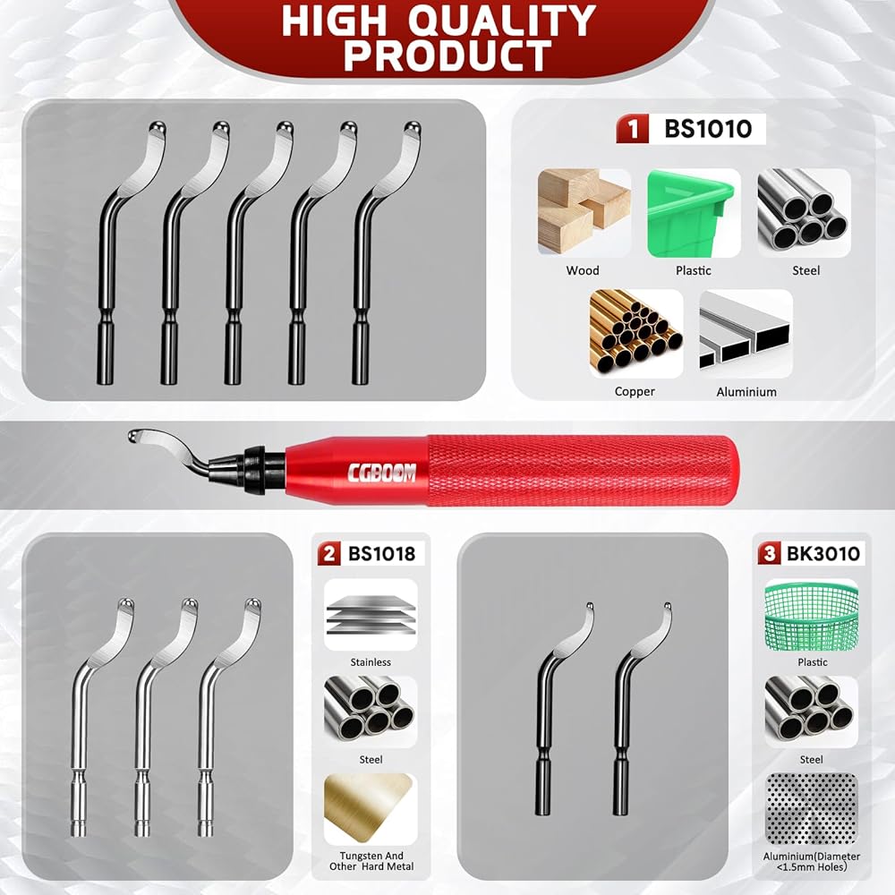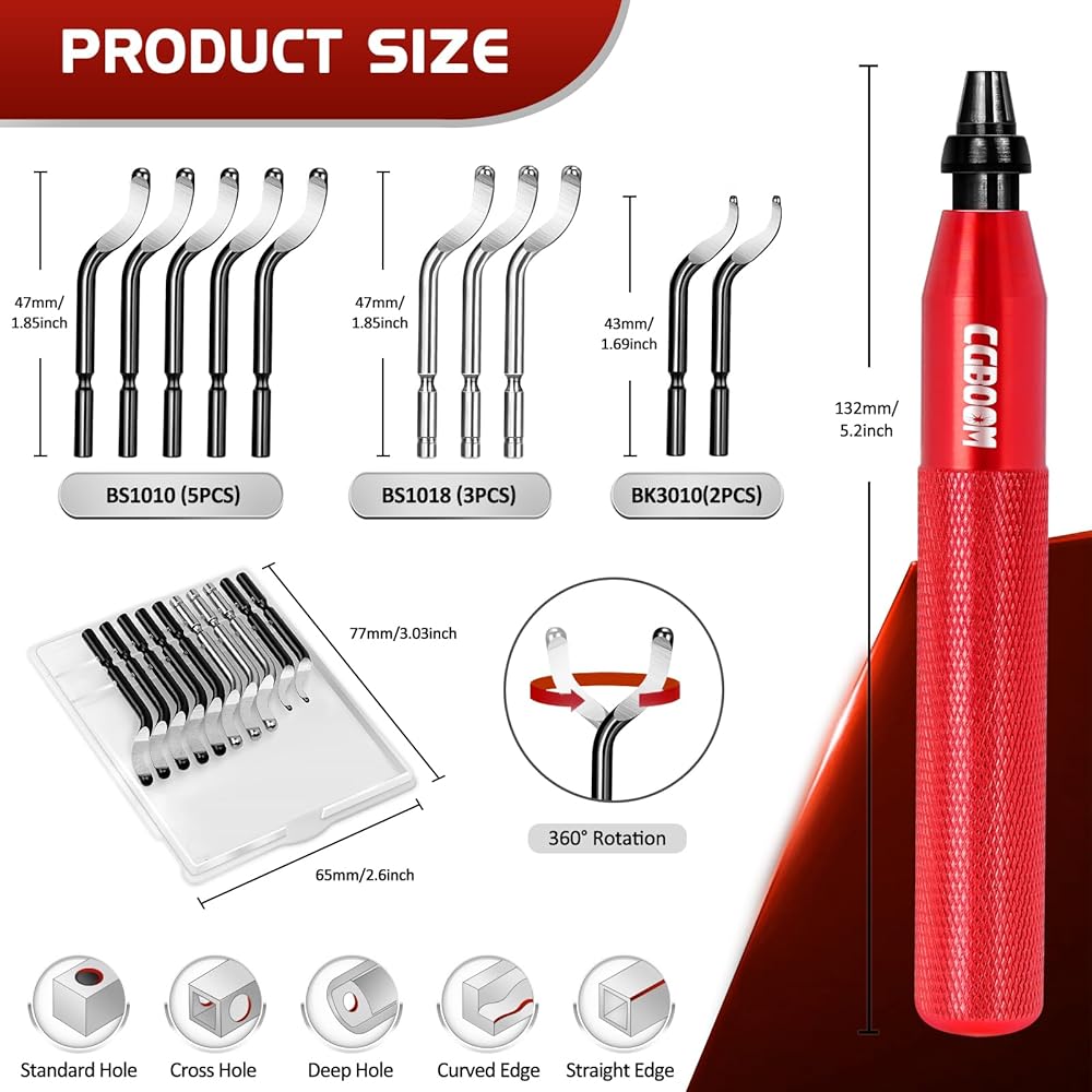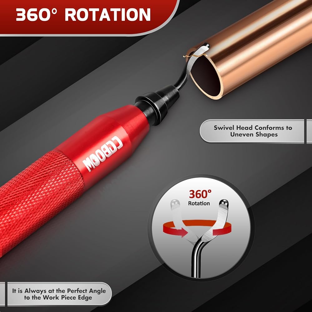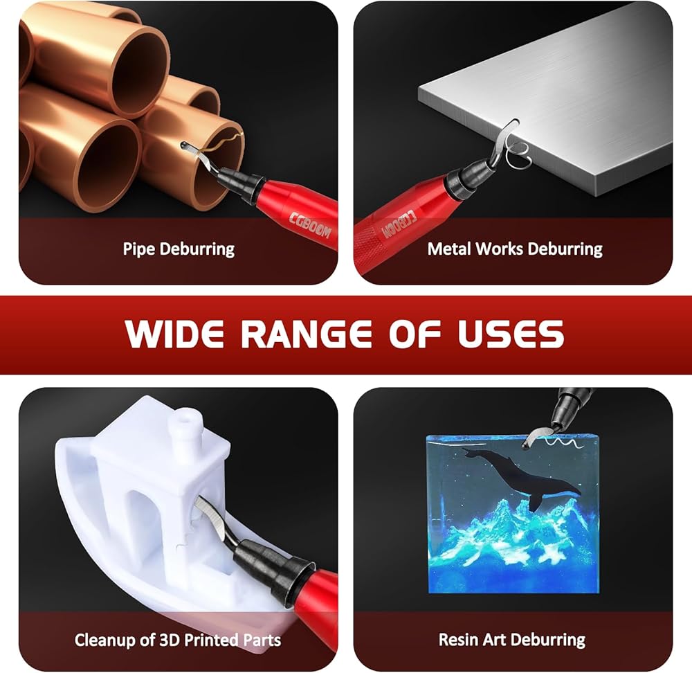 أداة وظيفة ميلتي: يعمل جهاز إزالة البور الخاص بنا بشكل رائع على الأنابيب المعدنية والبلاستيكية والنحاسية والبلاستيكية والنحاس والفولاذ والألومنيوم. من المفيد تقليم أعمالك المطبوعة والراتنجات ثلاثية الأبعاد. سواء كنت محترفًا صناعيًا أو من محبي الأعمال اليدوية، فإن أداة إزالة الحرق CGBOOM ضرورية لك!
