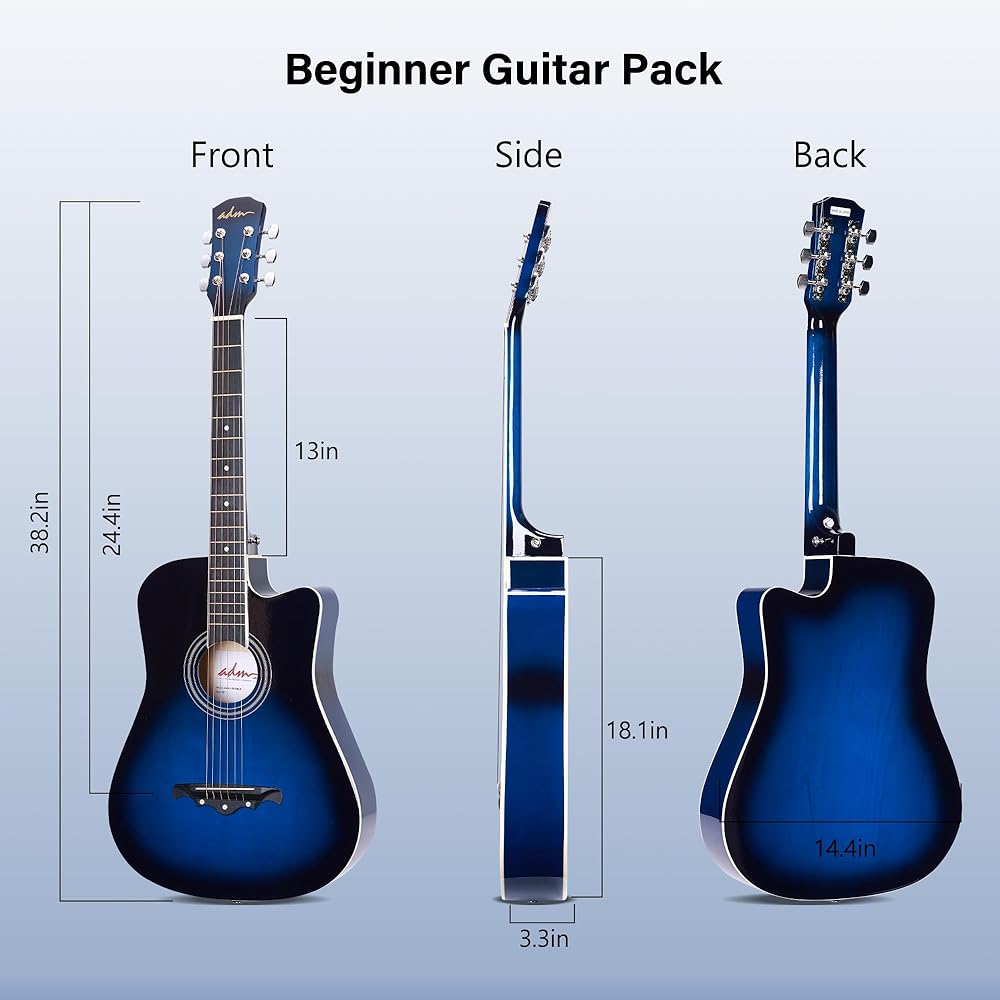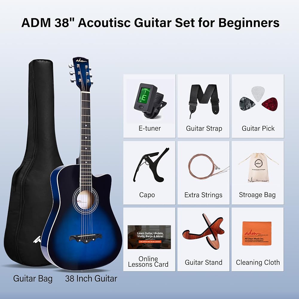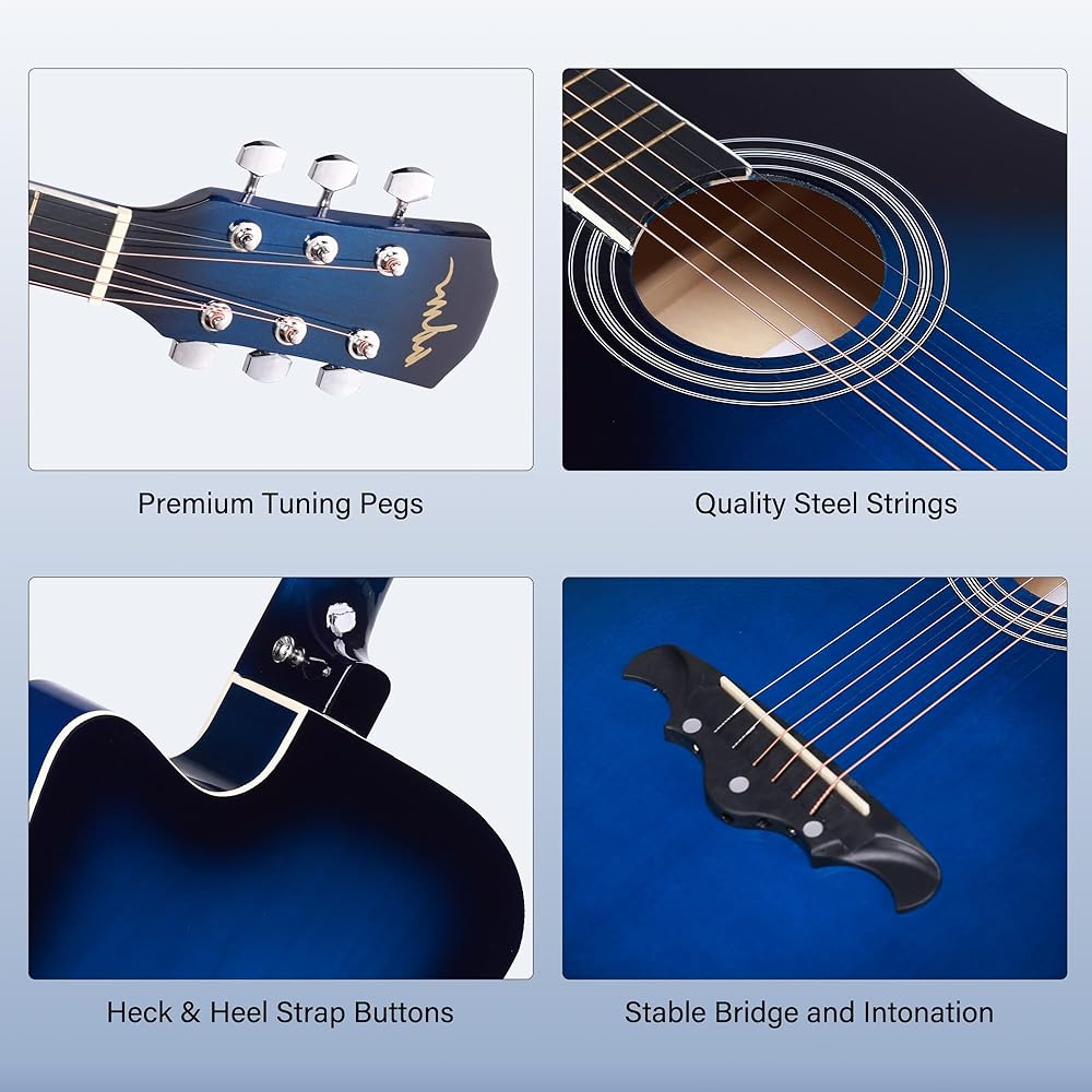 مجموعة كاملة للجيتار الصوتي للمبتدئين: تتضمن حزمة الجيتار للمبتدئين جيتار صوتي مقاس 38 بوصة، وحقيبة للعزف، و3 قطع، وحزام كتف، وكابو، ومجموعة إضافية من 6 أوتار، وقماش تنظيف، وحامل جيتار وبطاقة دروس عبر الإنترنت.