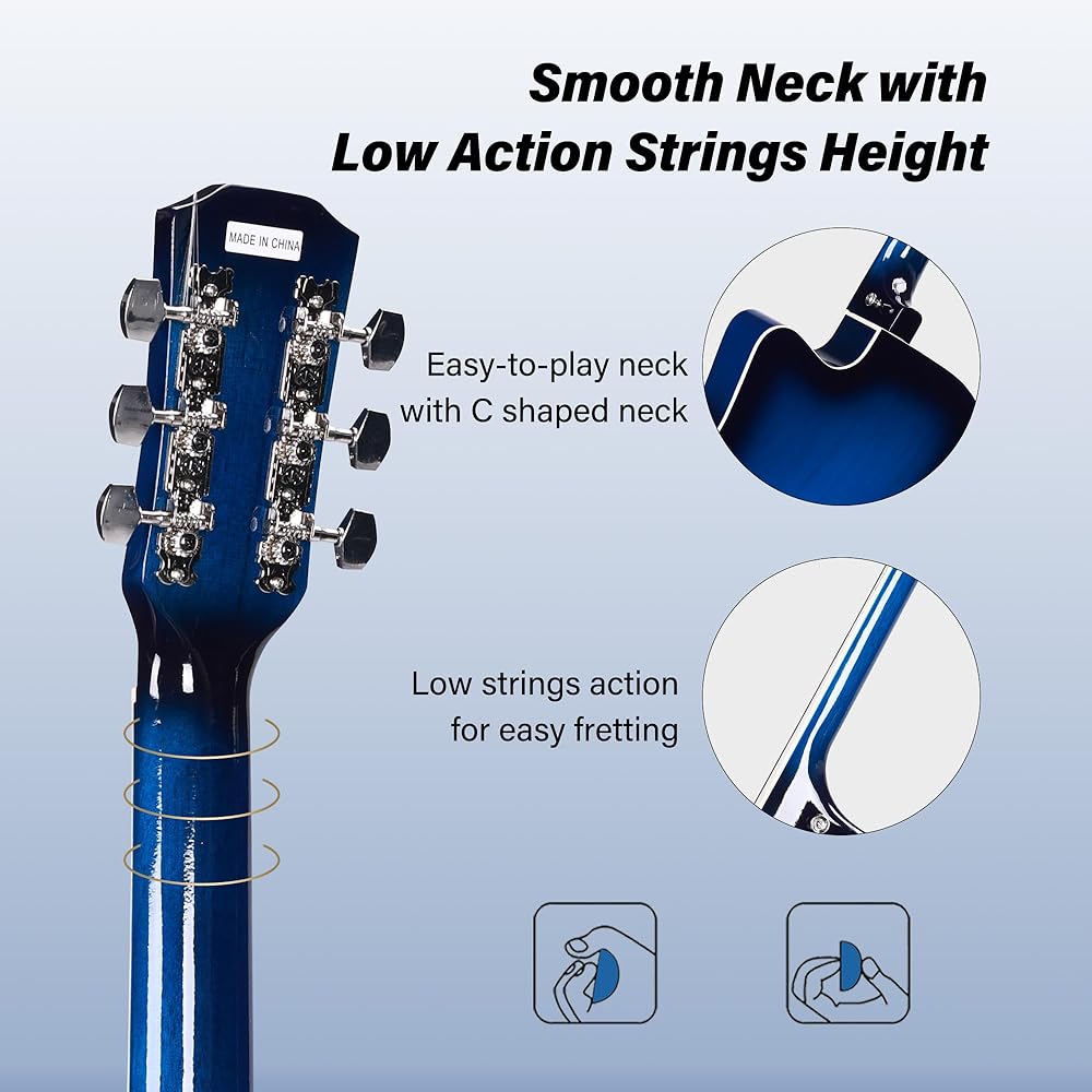 أقصى إمكانية للتشغيل: جيتار صوتي ADM مقاس 38 بوصة بجسم مقطوع، مما ينتج نغمة كاملة ونابضة بالحياة مناسبة لمختلف الأنماط الموسيقية؛ يعمل تصميمها على تحسين إمكانية اللعب والنغمة للمبتدئين، مما يوفر أداة عالية الجودة تشجع التعلم والنمو
