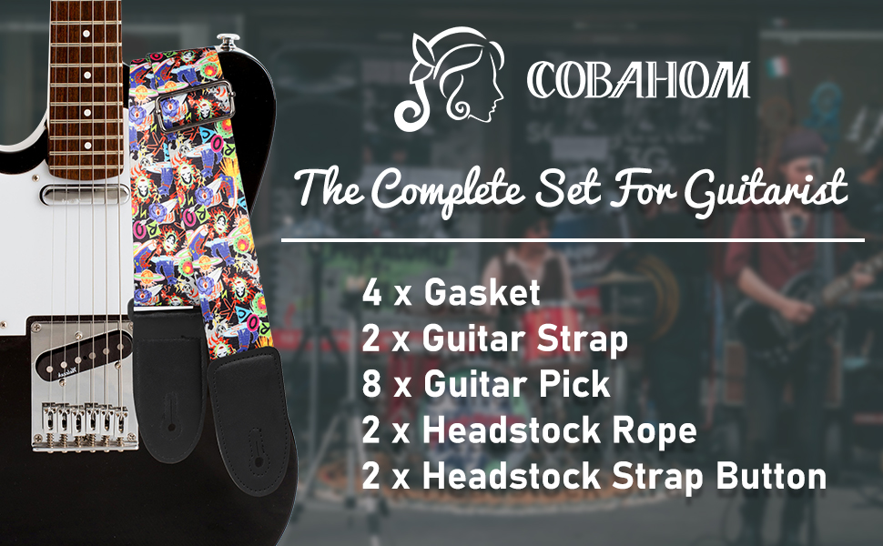 المجموعة الكاملة: تتضمن أحزمة الجيتار 8 قطع من أعواد الجيتار، 4 قطع جوانات، 2 قطعة زر حزام رأس، 2 قطعة حبل رأس. الملحقات العالمية مناسبة للجيتار الصوتي والجيتارات الكهربائية والباس والقيثارة وما إلى ذلك.