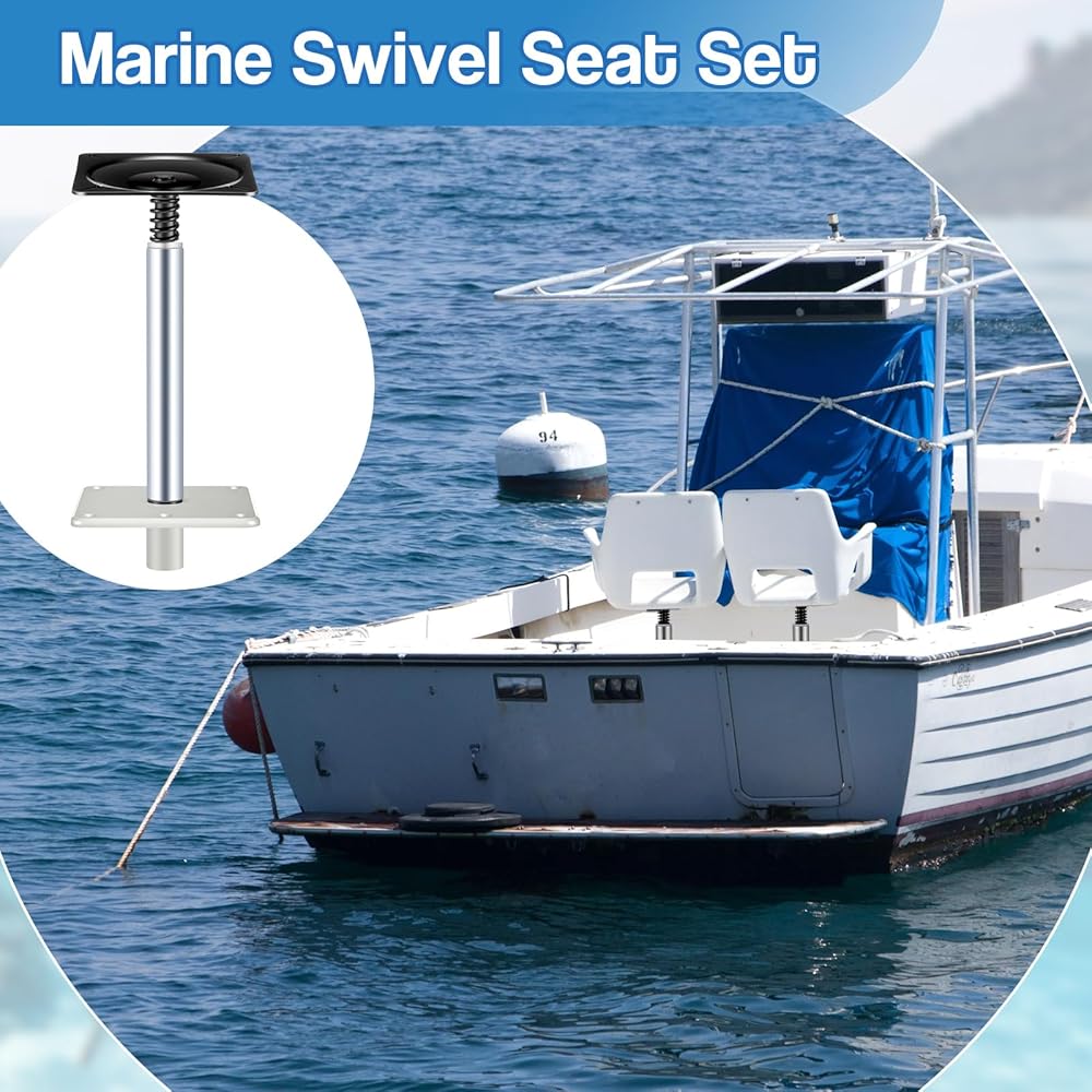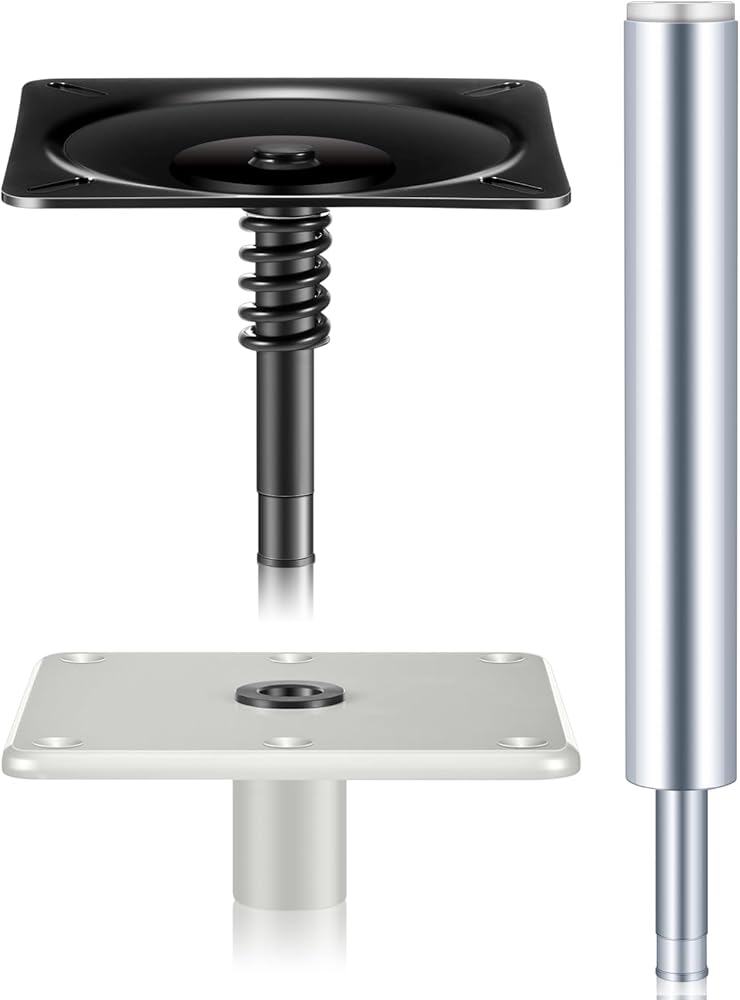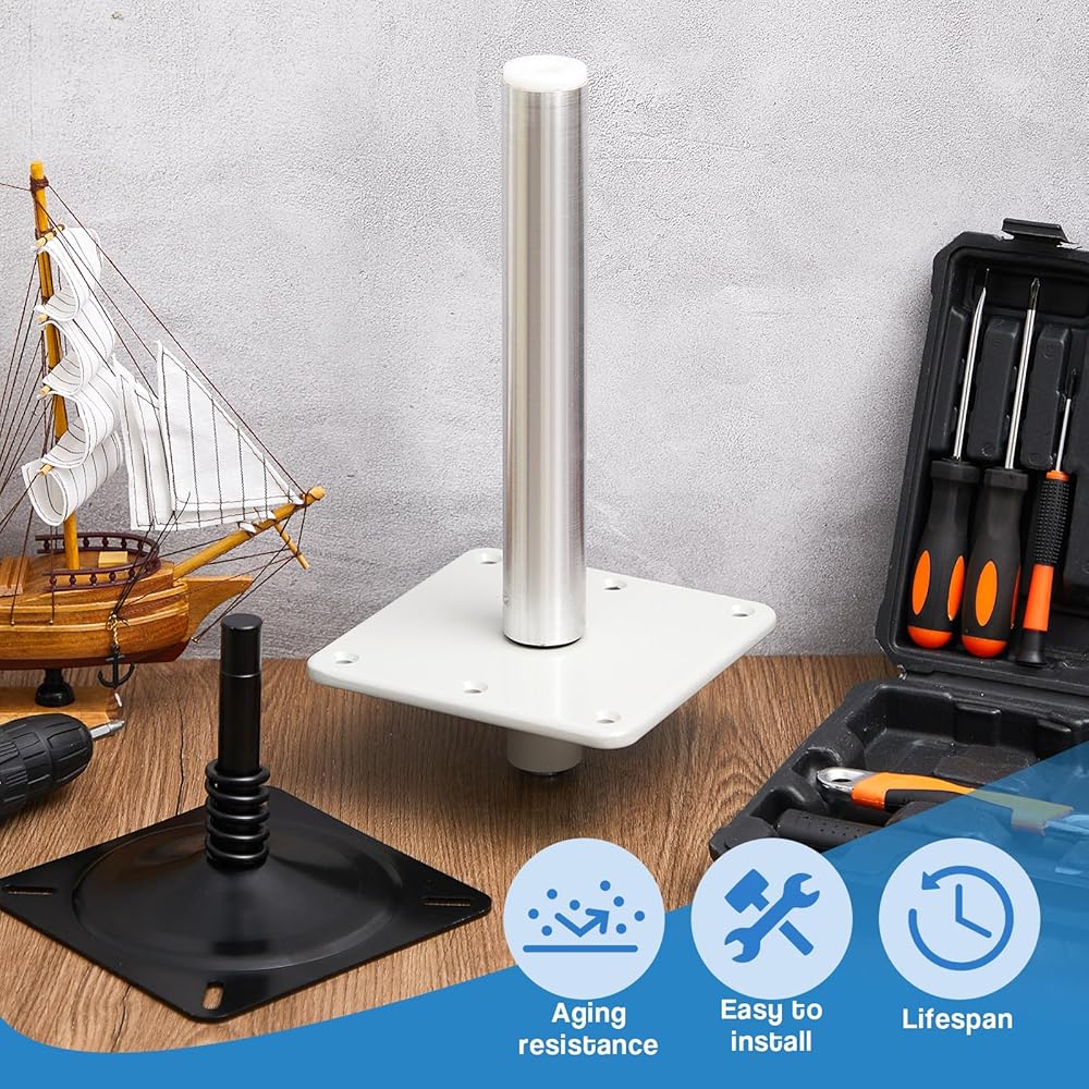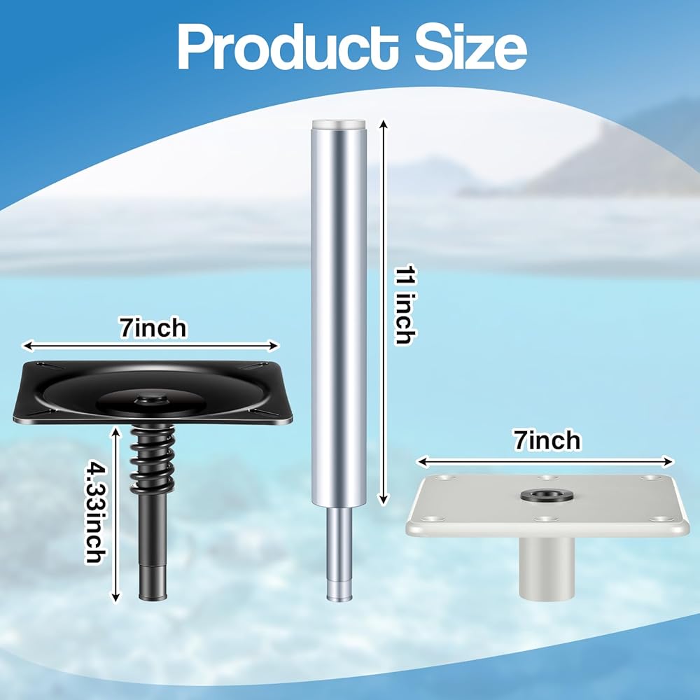 • Compact Size: the boat seat pedestal kit fits most vessels with its standardized size; The pedestal size in about 7 x 7 inches, making it convenient for a variety of uses; Additionally, the design incorporates an about 3/4" boat base pin post, optimizing your boat's functionality without overwhelming the space; This kit is corrosion resistant with 360-degree rotation, shock-absorbing spring and a detachable pin post