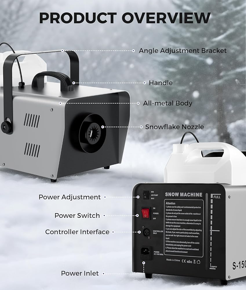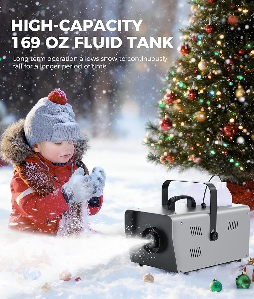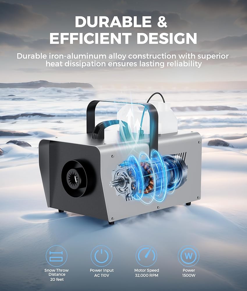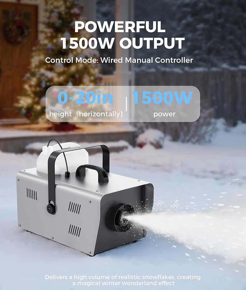 ماكينة ثلج قوية بقدرة 1500 وات: قم بإنشاء أرض عجائب شتوية سحرية مع مخرج ثلج قوي وكبير الحجم يصل طوله إلى 20 قدمًا (6 أمتار). مثالية للاستخدام الداخلي والخارجي، وتحول أي مساحة إلى مشهد احتفالي لعيد الميلاد والعطلات وحفلات الزفاف والحفلات والمناسبات الخاصة.