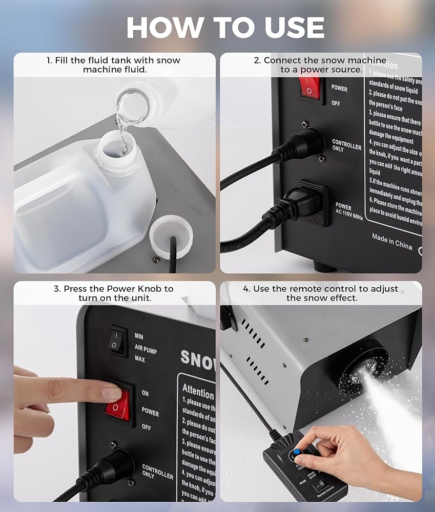 تشغيل سهل وجهاز تحكم سلكي: ابدأ بسرعة! ما عليك سوى إضافة سائل الثلج (غير متضمن)، ثم توصيله واستخدام جهاز التحكم عن بعد السلكي المتضمن لتساقط الثلوج بشكل فوري ومثير للإعجاب. مصمم لسهولة الإعداد والراحة، مما يجعله مثاليًا لنوادي الدي جي والعروض المسرحية وقاعات الرقص والمراقص وأي مناسبة احتفالية.