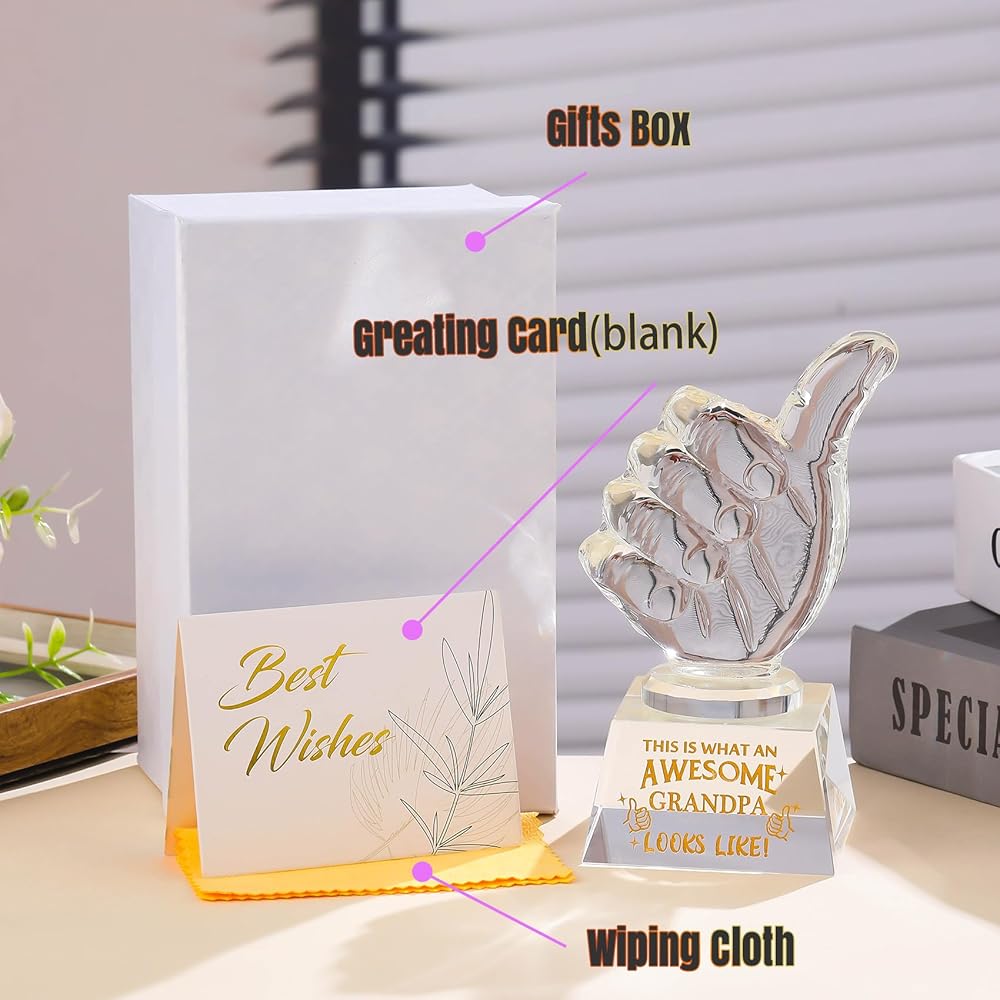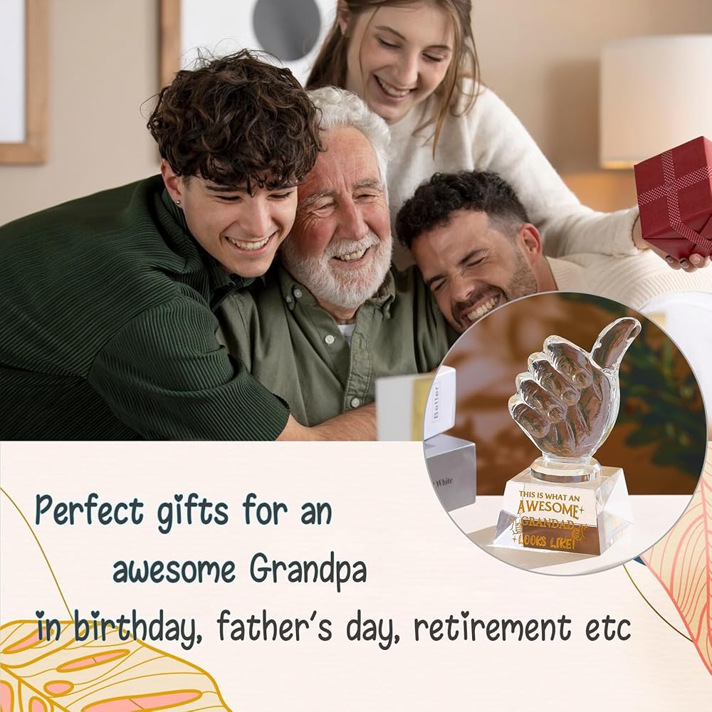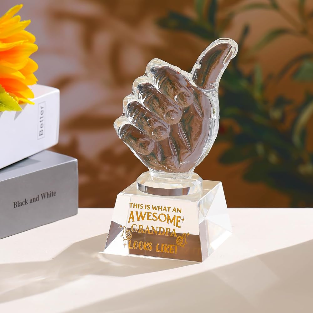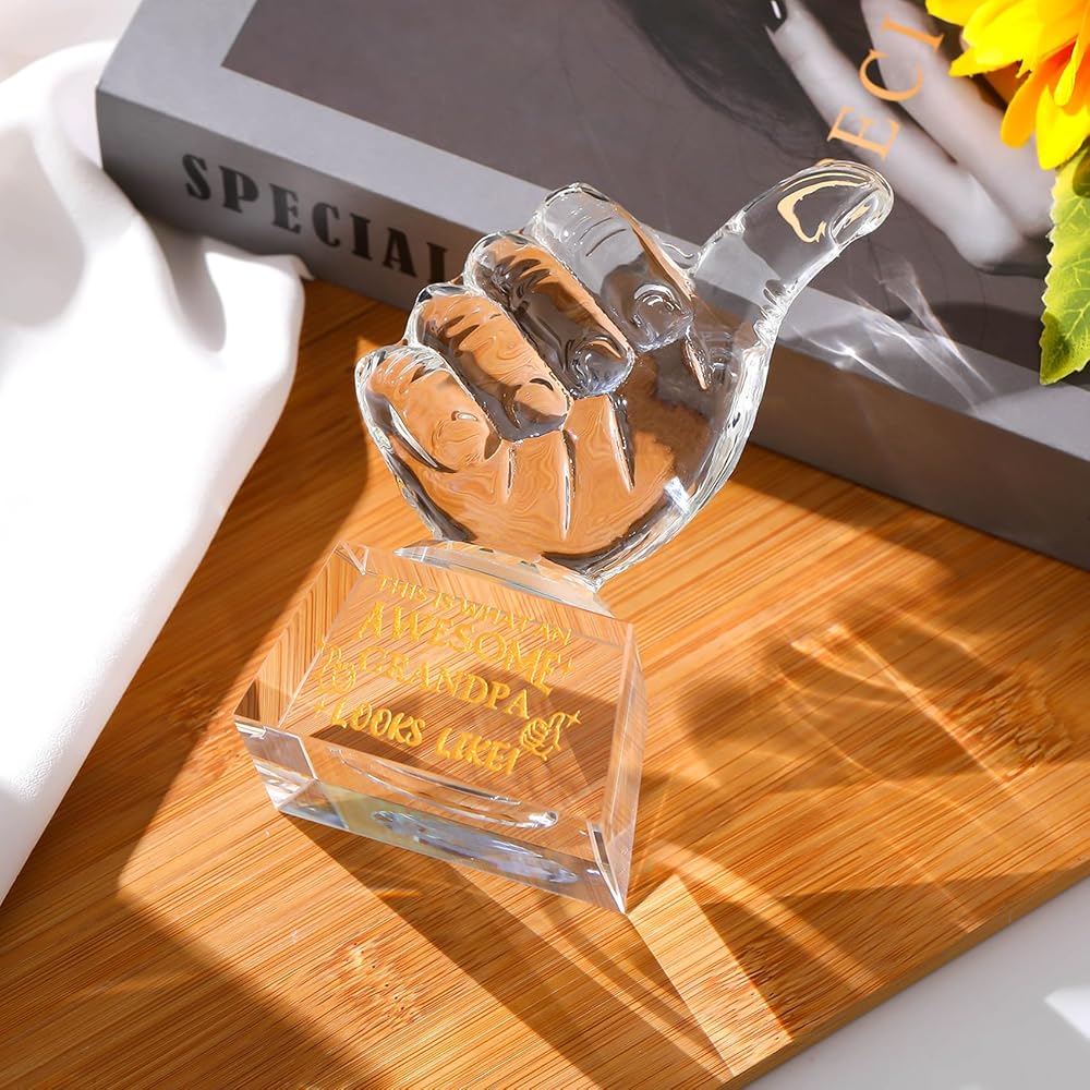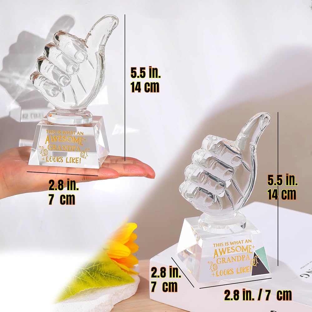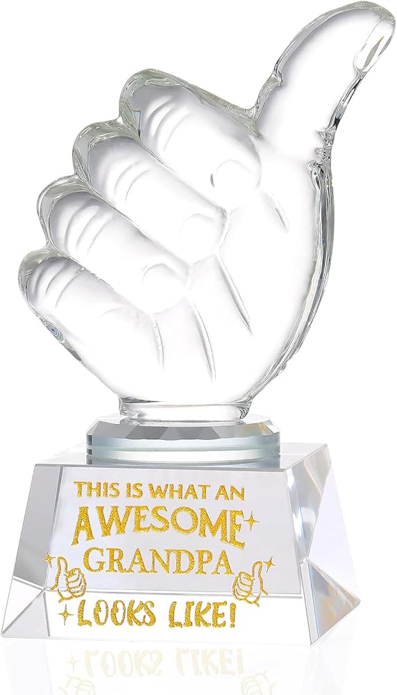 IDEAL GIFTS FOR GRANDPA: This crystal thumbs up trophy Engraved " THIS IS WHAT AN AWESOME GRANDPA LOOKS LIKE'' will be a great gifts for grandpa on birthday, father's day, Christmas, New Year. The golden text is sandblasted on crystal for clarity and brilliance. He will be very happy to receive this gift.