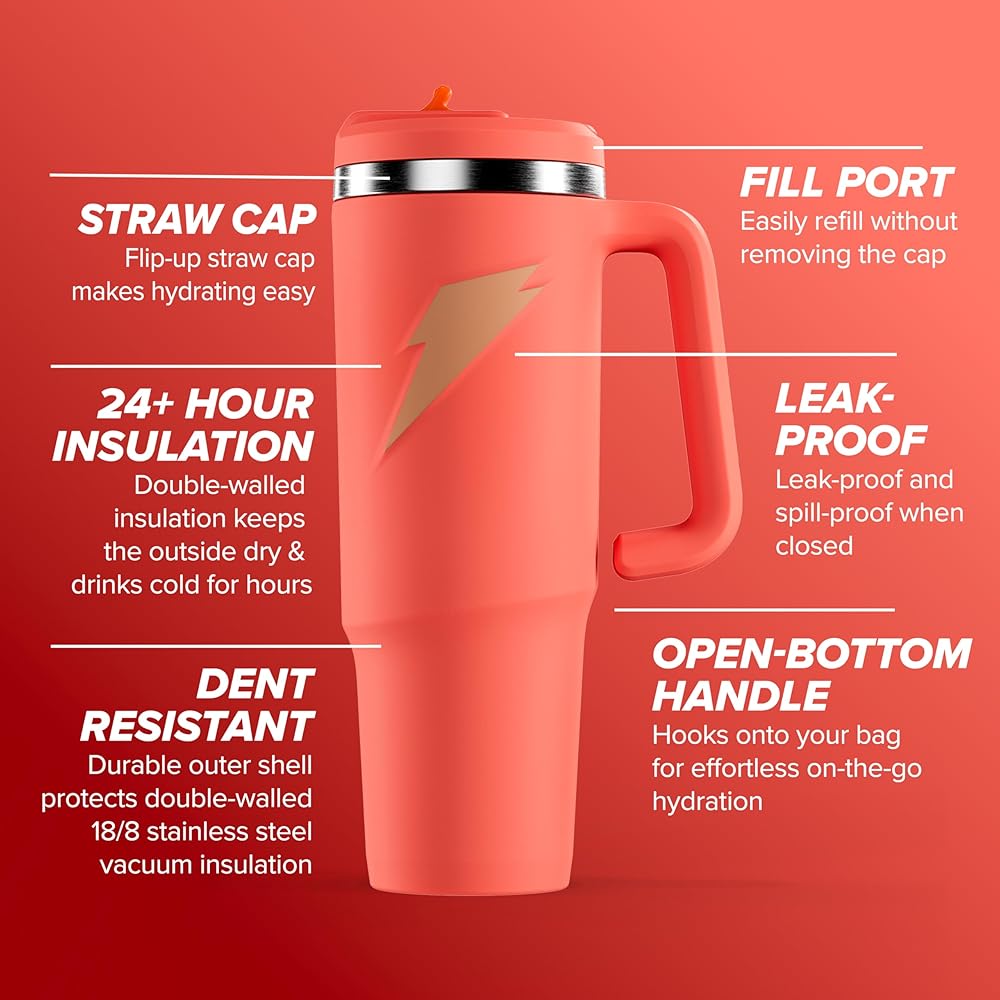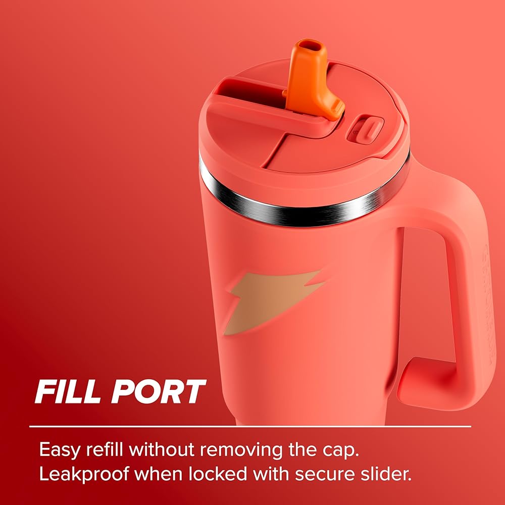 The 36oz Crossover Stainless Steel Tumbler makes all-day hydration easy, with a fill port for quick refills, leak-proof straw cap (when closed) and open-bottom handle. The Gatorade Crossover Stainless Steel tumbler is dent resistant, BPA-Free, and top rack dishwasher safe. Enjoy an easy flow straw cap for easy sipping, a fill port to refill easily without removing the cap, and an open bottom handle that slides into bags, cupholders, and back pockets. Double-walled insulation keeps the outside of the bottle dry and drinks cold for 24+ hours.