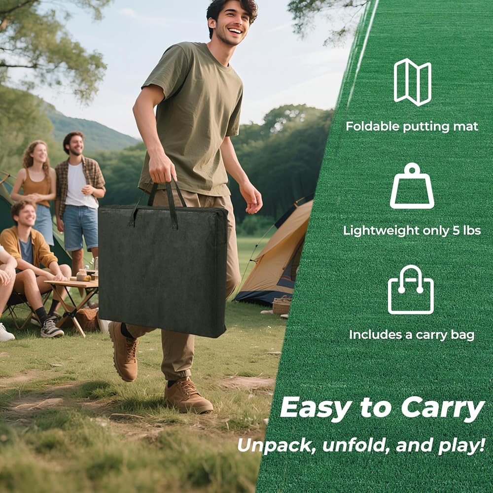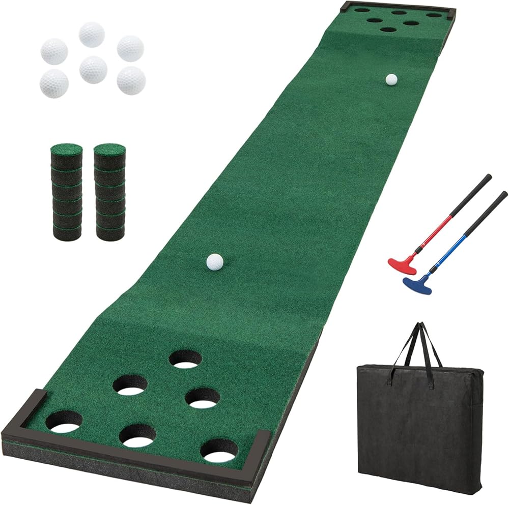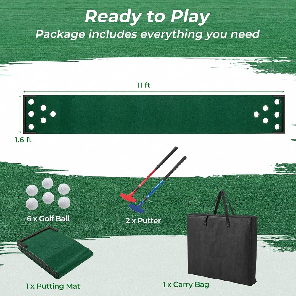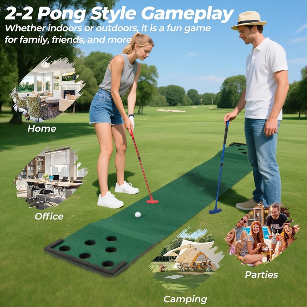 The package includes everything you need. The game offers engaging both side 6 holes style play, suitable for players of any age, enhancing the excitement at gatherings. The premium polyester mat features a smooth surface and foam slopes. Lightweight and portable, this golf game set is easily set up for a quick game. Whether indoors or outdoors, it is a fun game for family, friends, and more.