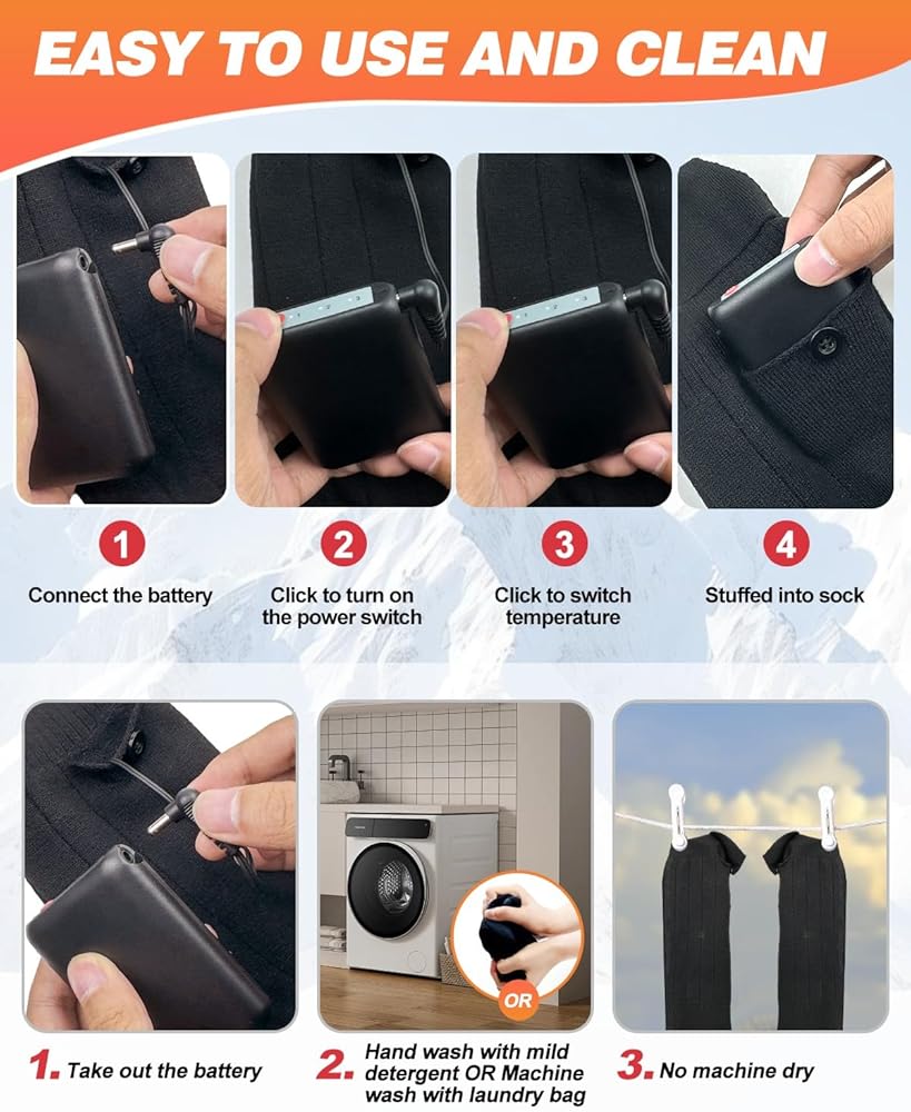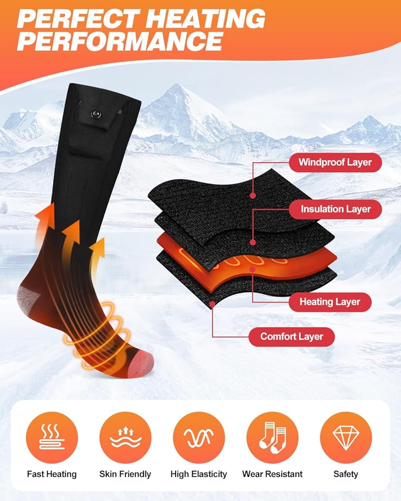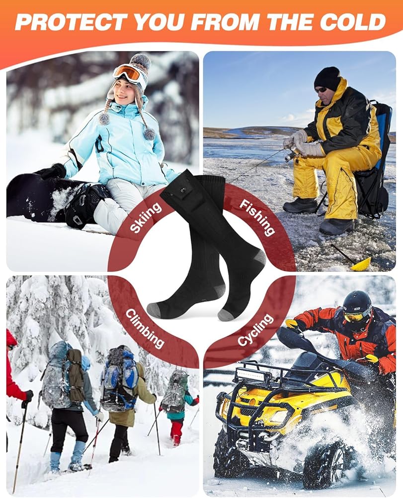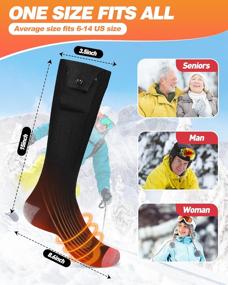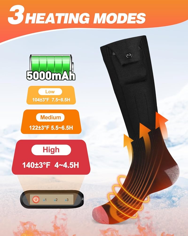 These rechargeable heated socks feature a "one size fits all" design that accommodates US sizes 6-14, making them suitable for most people, including seniors, men, and women, without the worry of incorrect sizing. Equipped with two high-capacity batteries, they offer up to 8.5 hours of continuous heating, eliminating concerns about short battery life. The socks provide three heating modes: High (140°F for 4-4.5 hours), Medium (122°F for 5.5-6.5 hours), and Low (104°F for 7.5-8.5 hours), catering to different temperature preferences. With an all-encompassing heating design that quickly warms both the soles and insteps, users can feel warmth within seconds of activation. Perfect for activities like motorcycling, hunting, camping, skiing, and hiking, they make an ideal winter gift for husbands, wives, dads, moms, grandparents, or anyone with cold feet.