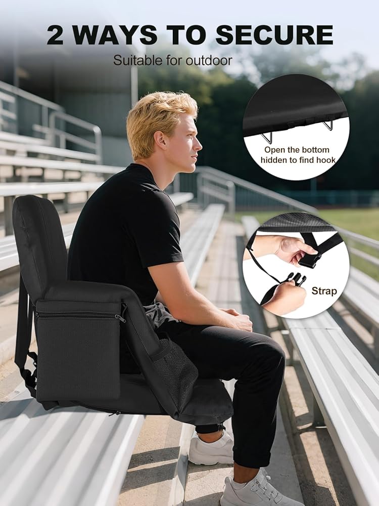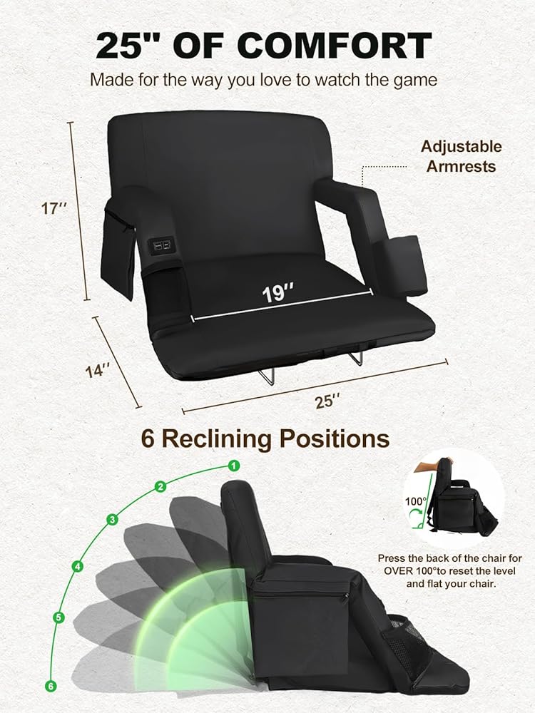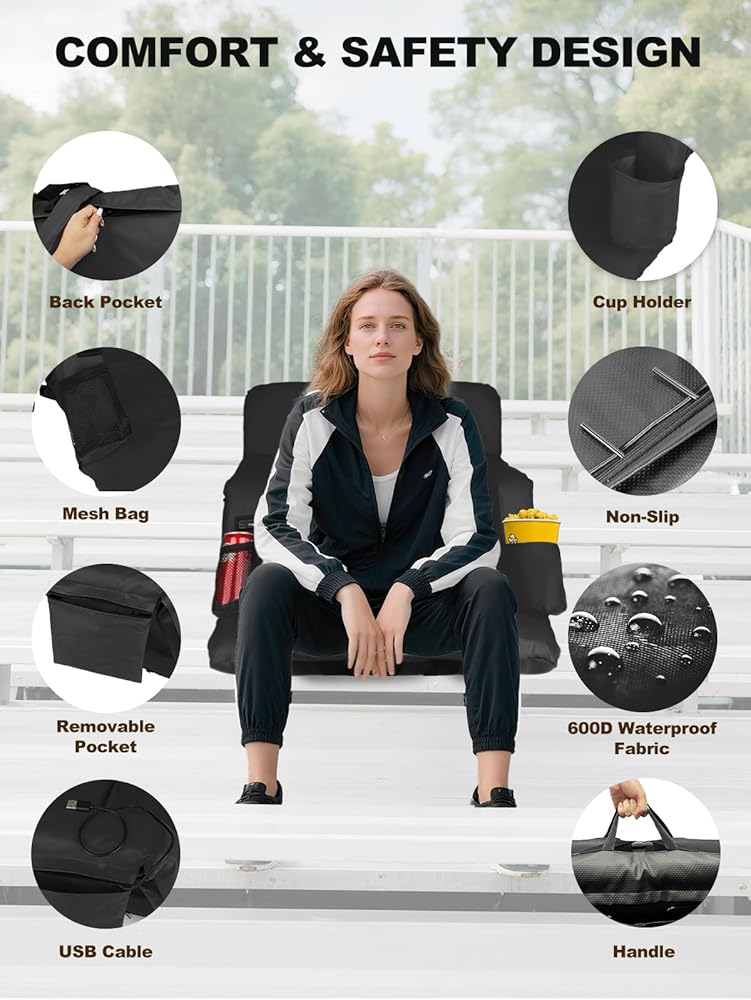 【مثالي لكل مناسبة】 بدءًا من التشجيع في الألعاب الرياضية وحتى الاستمتاع بالحفلات الموسيقية أو رحلات التخييم أو النزهات - يجعل مقعد الاستاد المُدفأ هذا مقاس 25 بوصة كل نزهة أكثر دفئًا واتساعًا وراحة. إنه أكثر من مجرد مقعد؛ إنه رفيقك المفضل للمتعة في الهواء الطلق.