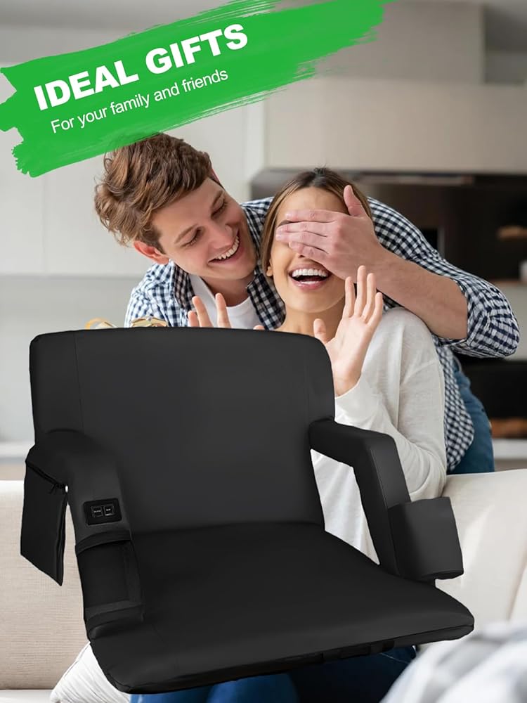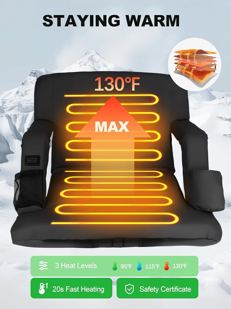 【الدفء عند الطلب - 3 إعدادات للحرارة】قل وداعًا لتجميد المبيضات المعدنية! يعمل مقعد الاستاد المُدفأ هذا على تدفئة ظهرك ومقعدك بثلاثة مستويات حرارة قابلة للتعديل (عالية/متوسطة/منخفضة)، تصل إلى 130 درجة فهرنهايت (54 درجة مئوية). سواء كانت مباراة في الصباح الباكر أو حفلة موسيقية في وقت متأخر من الليل، فسوف تشعر بالدفء والراحة في ثوانٍ.