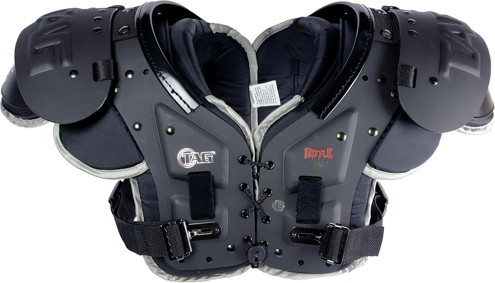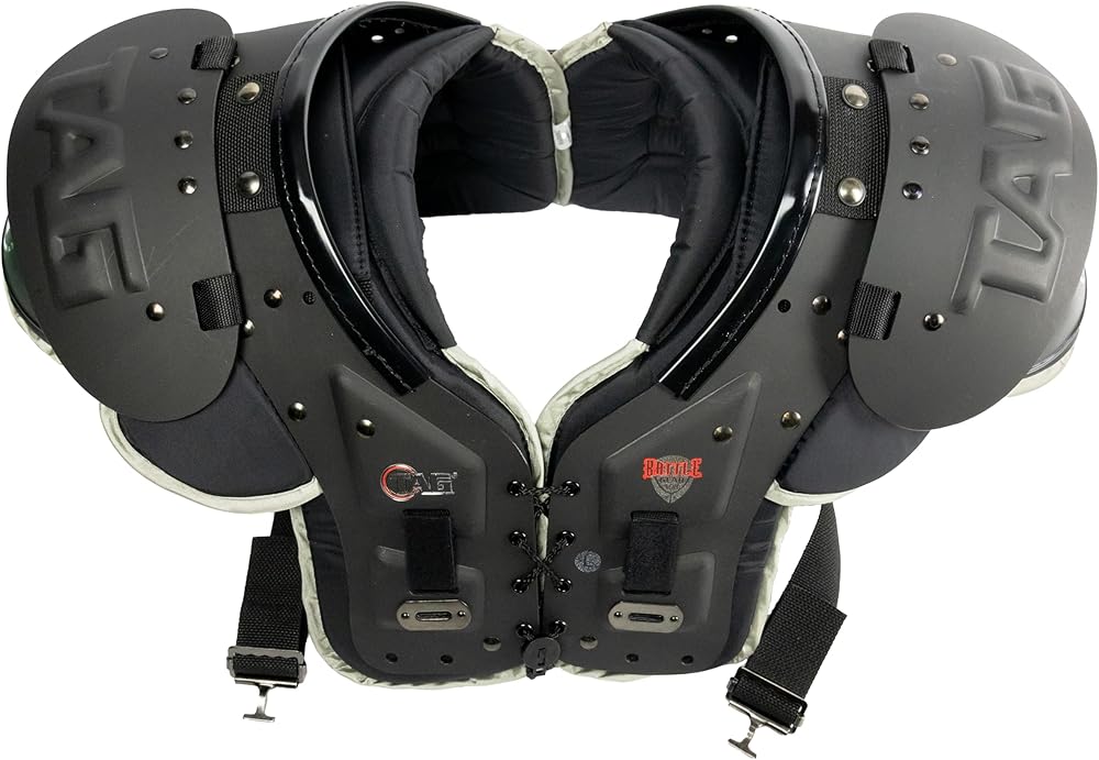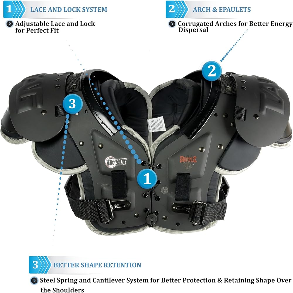 The TAG TSP100 Battle Gear II Intermediate Shoulder Pad offers many of the features that we build into our higher end shoulder pads. The pads have a HDOC arch padding construction with EVA foam on the shoulder areas and a clavicle shock pad system to protect the player. There is a Velcro neck adjustment that allows the player to have the most ideal fit. Drilled holes allow player to attach a back plate or rib pads. Features an easy adjustable lock-down underarm strap with swivel T-hook attachment. Choose size: Small (13"-14" shoulder, 120-150 lbs player weight); Medium (14"-15" shoulder, 150-180 lbs player weight); Large (15"-16" shoulder, 180-210 lbs player weight); X-Large (16"-17" shoulder, 210-240 lbs player weight). "Providing athletes of all ages an avenue to stay safe and competitive on all fields of play" For over 30 years, TAG has been dedicated to providing innovative, high quality and safe athletic equipment, apparel, and uniforms to teams, high schools, universities, and professional organizations across the globe.