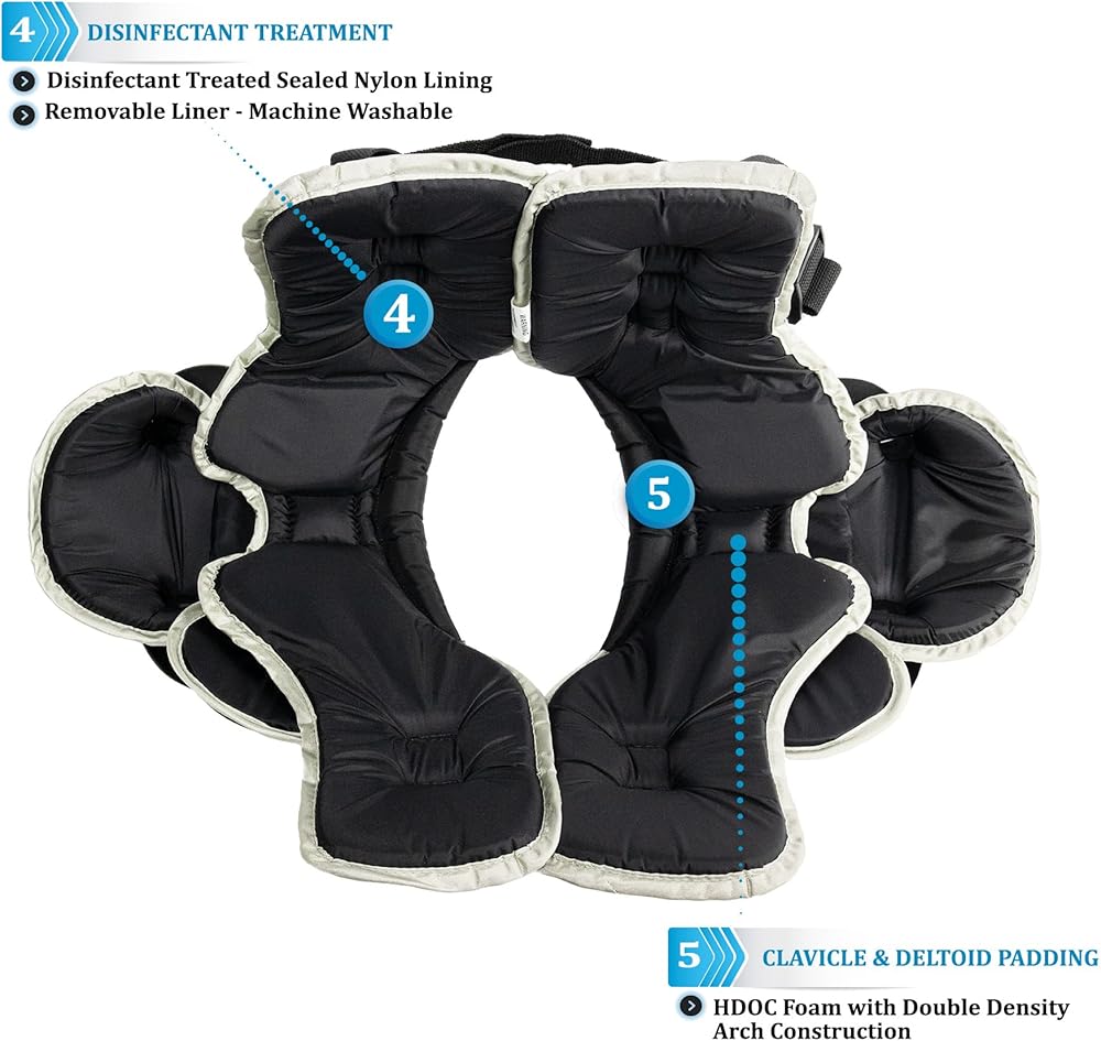 Black nylon cover and HDOC Arch padding construction. EVA foam outside shell; comfort inside open cell foam. Clavicle shock pads. All black durable matte finish 3.6mm plastic.