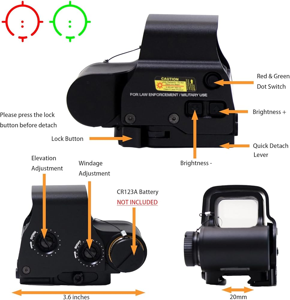 • 558 نقطة رؤية حمراء/خضراء ثلاثية الأبعاد: يحتوي 558 على 10 مستويات لضبط السطوع ويستخدم قاعدة تحرير سريعة للتثبيت والإزالة السريعة.