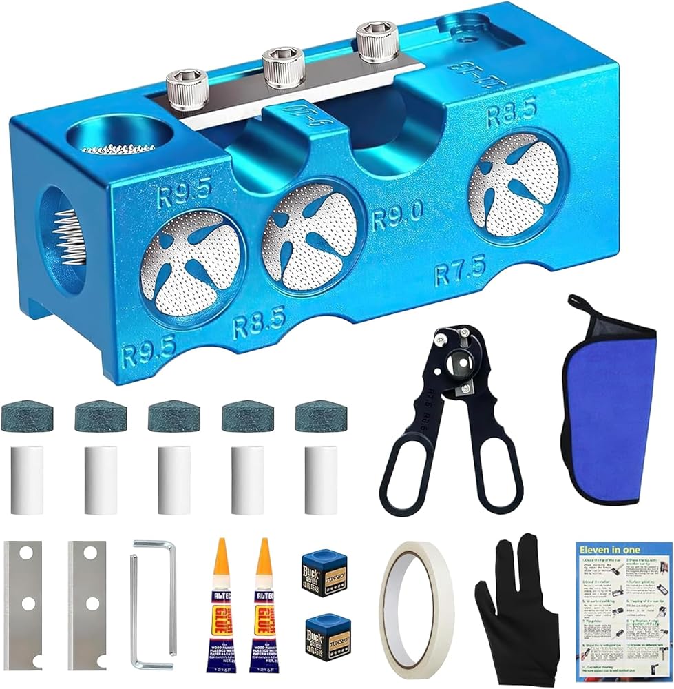 Comprehensive All-Inclusive Kit : This professional-grade set comes fully equipped with every essential for complete cue maintenance: multiple shapers (various profiles/sizes), precision trimmers, texture-enhancing scuffers, high-gloss burnishers, stabilizing clamps, plus spare blades, adhesive tape, specialized glue, and detailed instructions. For added convenience, we've included protective three-finger gloves and a premium billiard towel.