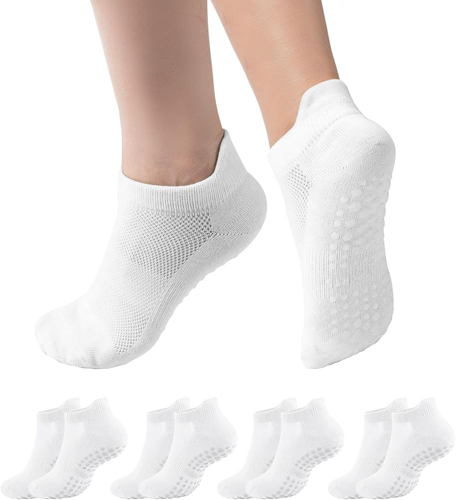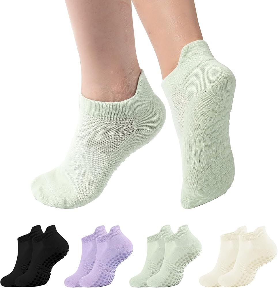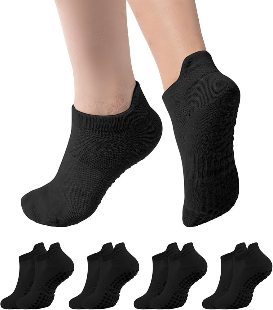 جوارب يوجا مضادة للانزلاق: الجزء السفلي من الجوارب مجهز بجزيئات سيليكون مضادة للانزلاق، والتي يمكن أن تكون ثابتة مثل الالتصاق بالأرض، مما يوفر قبضة موثوقة على الأسطح الملساء المختلفة ويمنع الانزلاق أثناء التمرين.