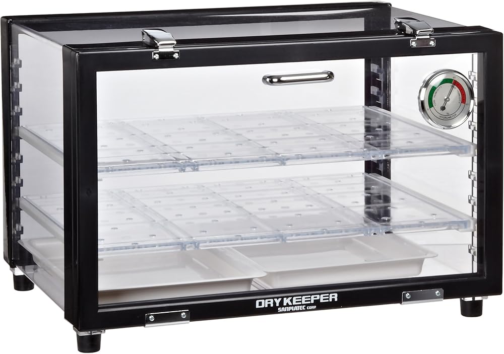 - Dial hygrometer on door indicates moisture level in cabinet; use with Scienceware desiccant cartridges, canisters or similar desiccant