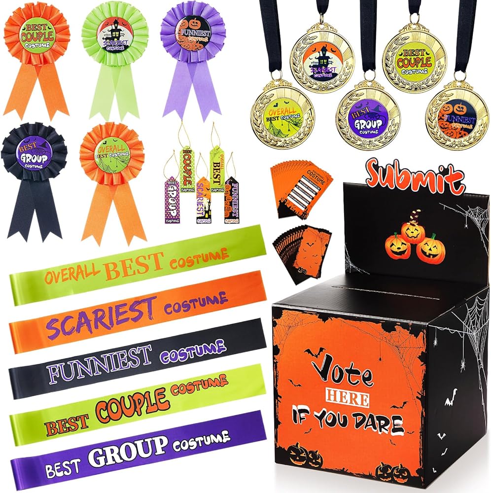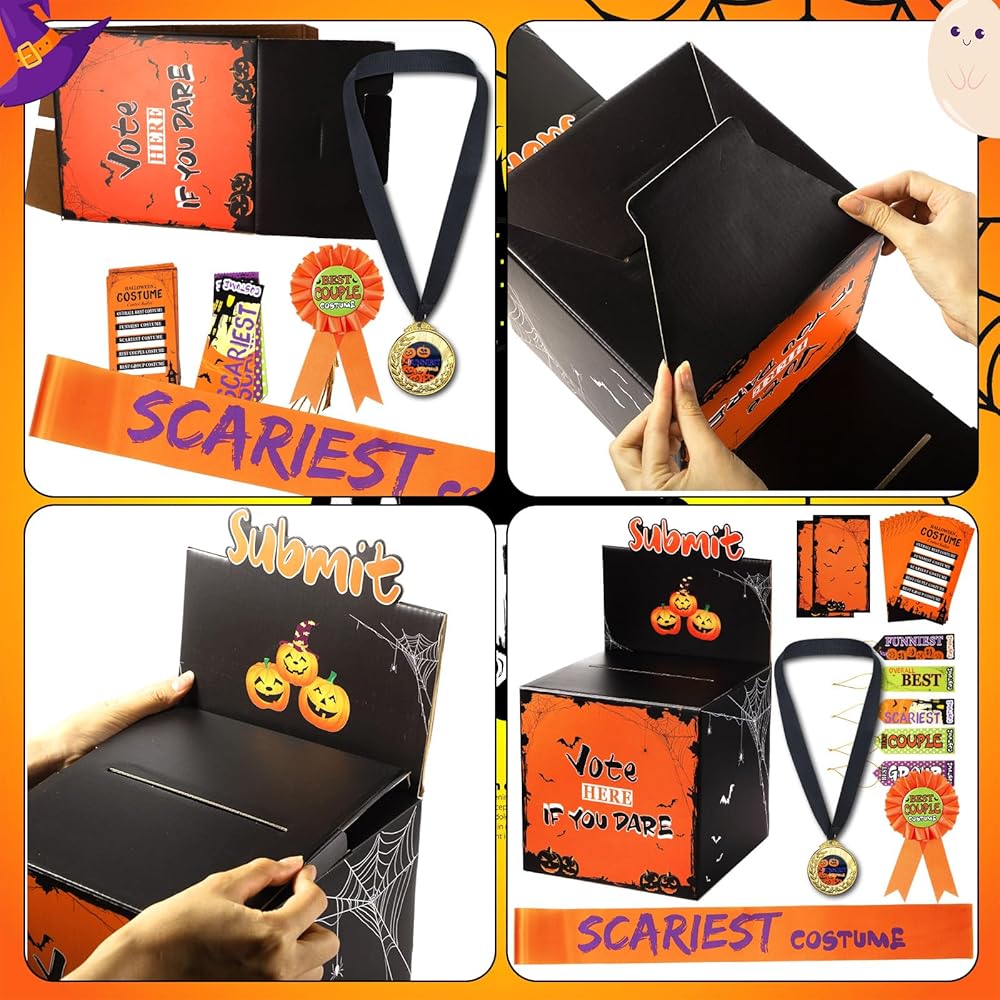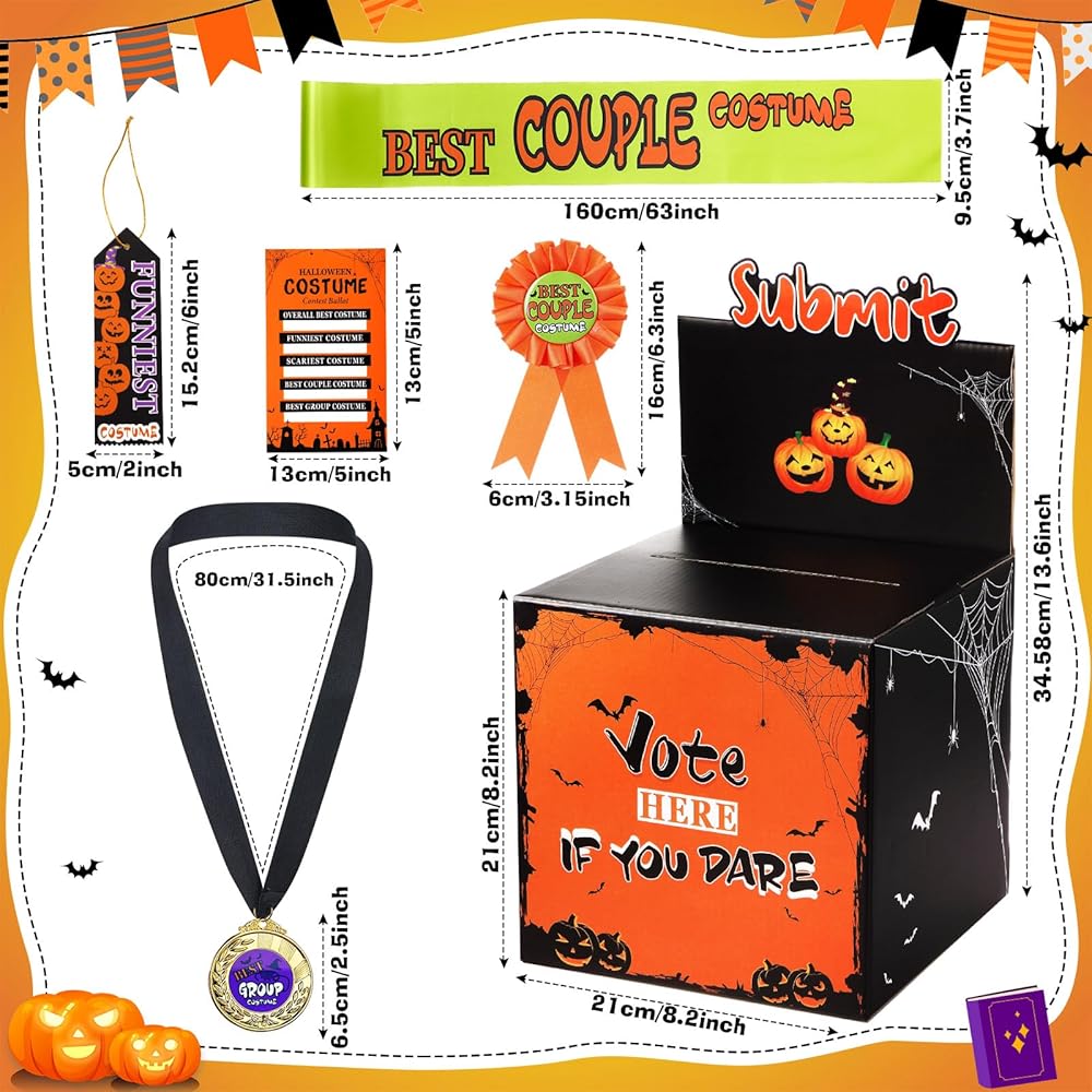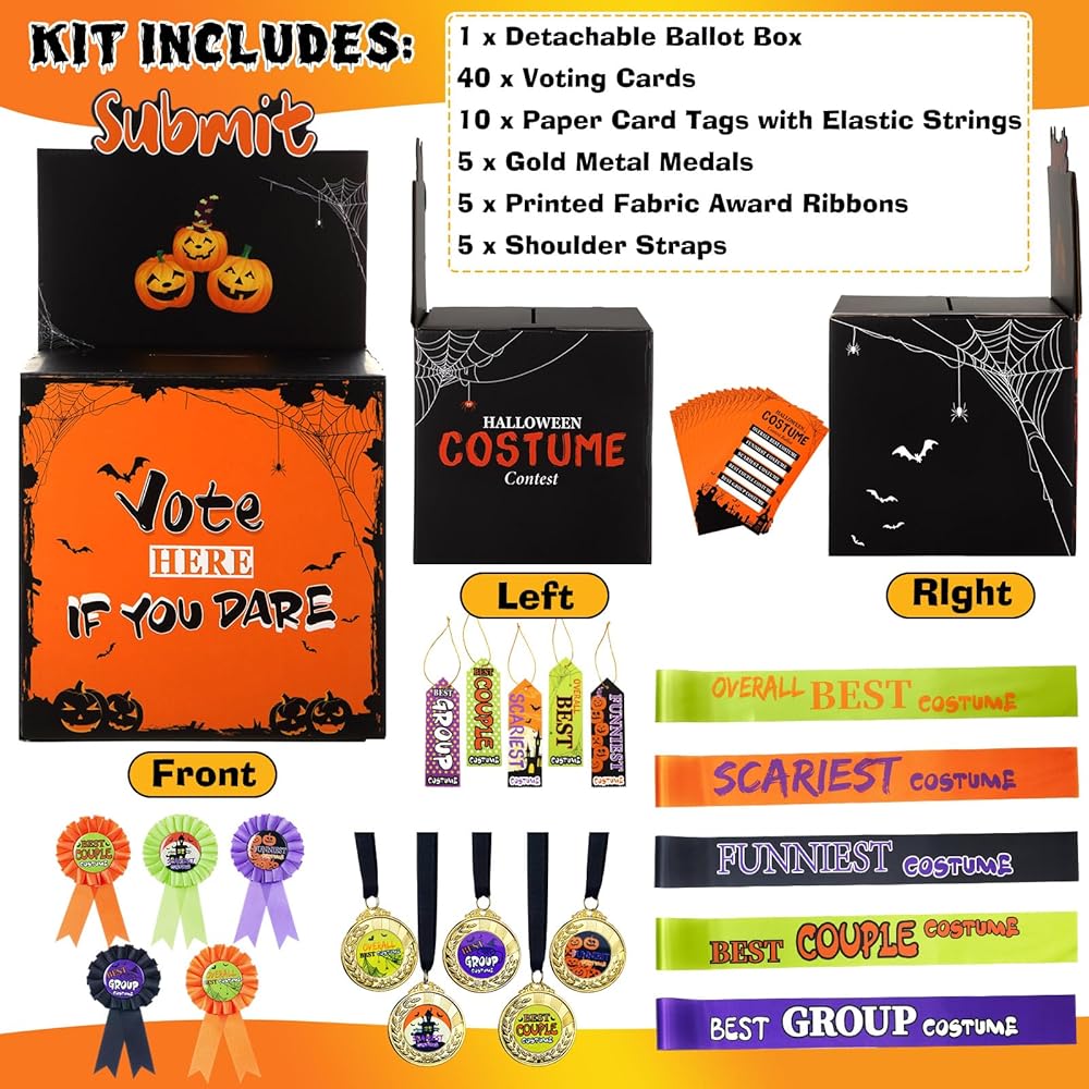 مجموعة تصويت الهالوين الكل في واحد: تتضمن صندوق اقتراع برتقالي قابل للفصل (13.8 × 8.3 × 8.3 بوصة)، و40 بطاقة تصويت (5.1 × 3.1 بوصة)، و10 بطاقات ورقية بأشرطة مرنة (5.9 × 2 بوصة)، و5 ميداليات معدنية ذهبية، و5 أشرطة جوائز قماشية مع عناوين مطبوعة، و5 أحزمة كتف متطابقة؛ مجموعة كاملة لاستضافة مسابقة أزياء الهالوين الممتعة والتي لا تُنسى
